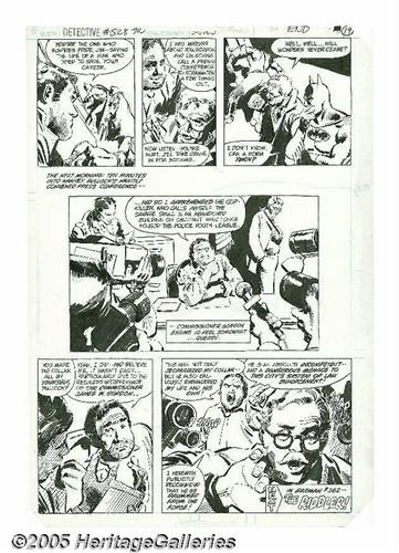 <B>Gene Colan and Klaus Janson - Detective Comics #528, page 19 Original Art (DC, 1983).</B></I> The cop-killer who calls himself the Savage Skull has been apprehended. During the press conference, Harvey Bullock does an about-face with Commissioner Gordon, and accuses him of being a dangerous menace to Gotham's system of law enforcement, in this final page from the story, "Requiem for Skulls," which was written by Doug Moench. The image area measures 10" x 15", and, aside from some corner trimming done during the printing process, the art is in Excellent condition.