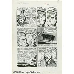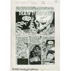 <B>Gene Fawcette - Adventures into Darkness #13 Complete 4-page Story "Death Dives Deep" Original Art (Standard Comics, 1954).</B></I> The Standard Comics editors and art directors were so enamored with Alex Toth's design-oriented approach to comic art, that his work soon set a "house style" for Standard. The versatile Gene Fawcette has no problem fitting in with that program, as he delivers an elegantly spare art style that cuts right to the essence of the shapes and design of each comic book page. In this chiller, free-lance diver Ned Jayson pays for his cold-blooded betrayal of fellow treasure hunter Remon Tamarro, fifty fathoms down. Each page has an image area that measures 12" x 18". Panel three of page three has a piece of yellowed tape across its lower left corner; otherwise the art is in Excellent condition. Each page was signed in blue pencil by Gene Fawcette. This yarn is a beauty!