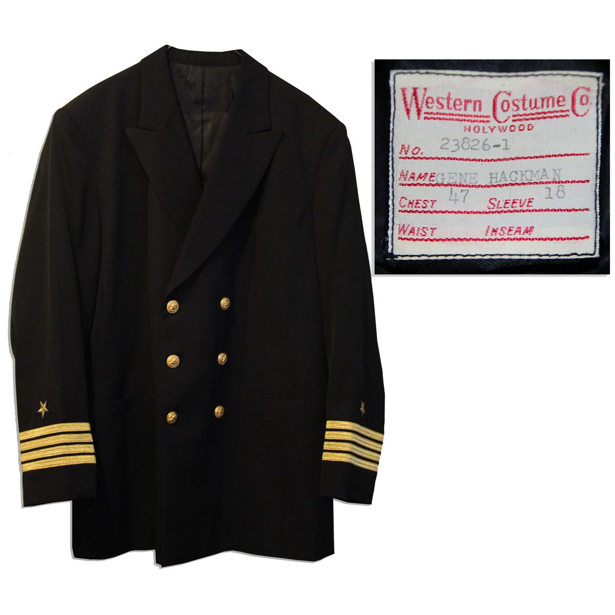 Gene Hackman coat from ''Crimson Tide''. Hackman stars as submarine commander Captain Frank Ramsey. Double-breasted black navy costume coat features gold stripes to the cuffs and brass tone buttons. Approximate size 43. Near fine. With a Disney Auctions COA.