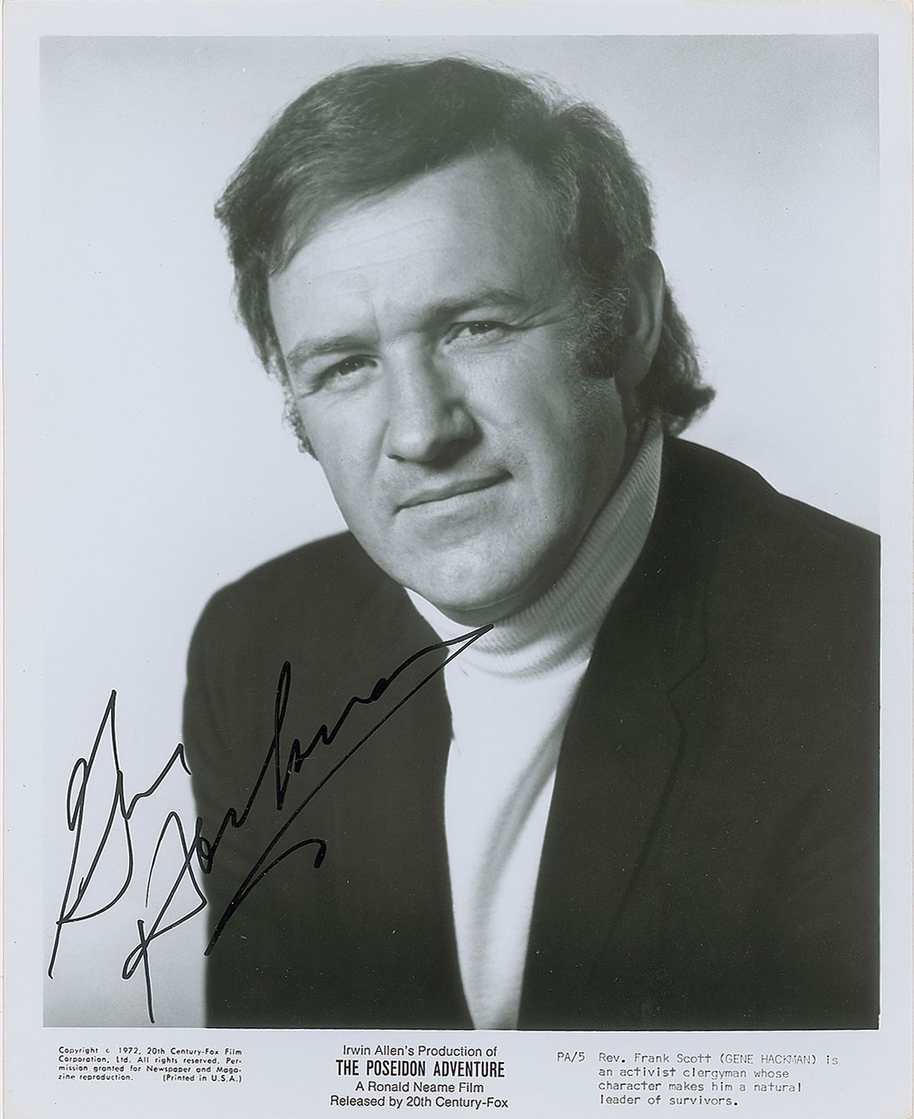 Glossy 8 x 10 promo photo of Hackman as Reverend Frank Scott in the 1972 disaster film The Poseidon Adventure, signed in black felt tip. In fine condition, with a few small surface creases and impressions.