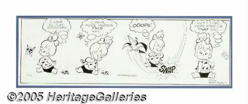 <B>Gene Hazelton - The Flintstones Daily Comic Strip Original Art, dated 10-2 (Hanna-Barbera, circa 1960s).</B></I> Adorable Pebbles is front and center in this undated daily strip drawn by Gene Hazelton, which clearly details the circle of life. The Flintstones were in their final season on television when this strip appeared, but the strip continued on until the '80s. The image area measures 20.5" x 6.5" and the art is in Excellent condition.