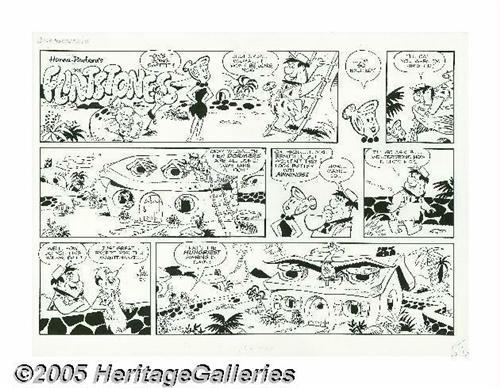 <B>Gene Hazelton - The Flintstones Sunday Comic Strip Original Art, dated 9-5-65 (Hanna-Barbera, 1965).</B></I> Fred's doing a little home improvement, but he needs advice from a neighbor. An amusing gag, beautifully rendered with crisp artwork by Gene Hazelton, perfectly capturing the style of the television series. A nice big piece, perfect for display, the image area measures 25" x 17.25", the artwork is in Excellent condition.
