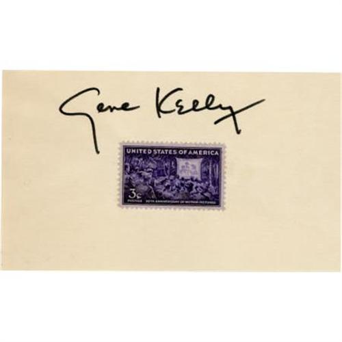 <B>Gene Kelly Autograph.</B></I> A 5" x 3" card, with a three-cent commemorative postage stamp affixed, signed by the beloved actor/dancer/choreographer in black ink. Kelly's autograph extends across the top of the card and is large and clean. In Excellent condition.<BR><BR><b>Shipping:</b> Flat Material, Small (<a target="_blank" href="http://www.heritageauctions.com/common/shipping.php">view shipping information</a>)
