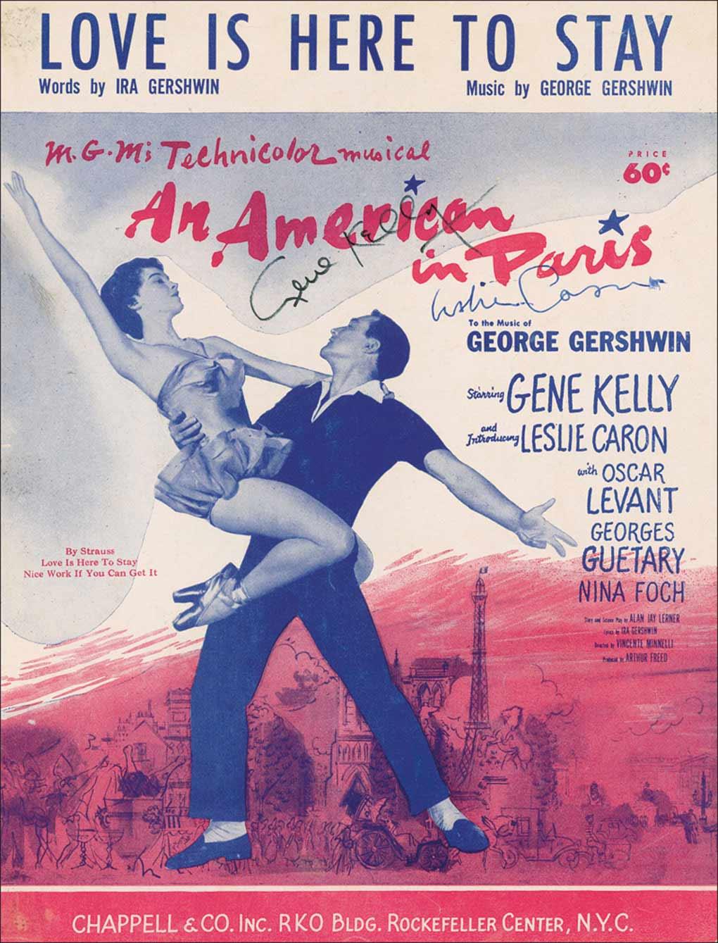 Sheet music of “Love Is Here to Stay” from the film An American in Paris, 9 x 12, five pages. Signed on the front cover in blue ink by Leslie Caron, and in black felt tip by Gene Kelly. In fine condition, with some light soiling and creasing to cover, and light toning to inside pages.