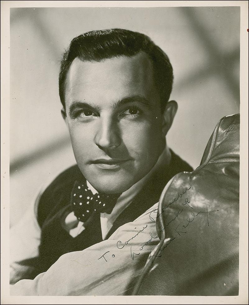 Vintage glossy 8 x 10 head-and-shoulders photo, signed and inscribed in fountain pen “To Connie Boeseber, Good luck, Gene Kelly.” In very good condition, with scattered creases and surface marks and some light contrast to signature.