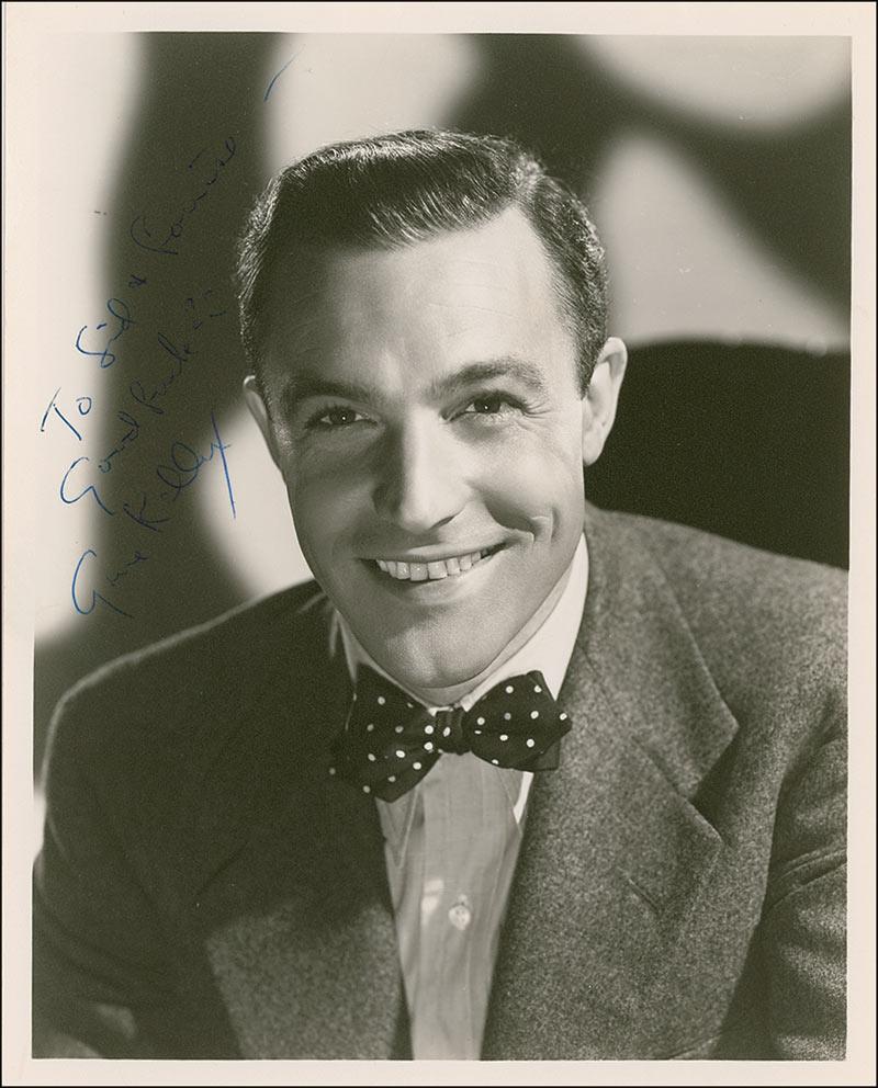 Vintage matte-finish 8 x 10 photo of a grinning Kelly in suit jacket and polka dot bow tie, signed and inscribed in blue ballpoint “To Sid & Louise—Good Luck, Gene Kelly.” In fine condition, with very slight rippling only affecting upper border and moderate signature contrast.