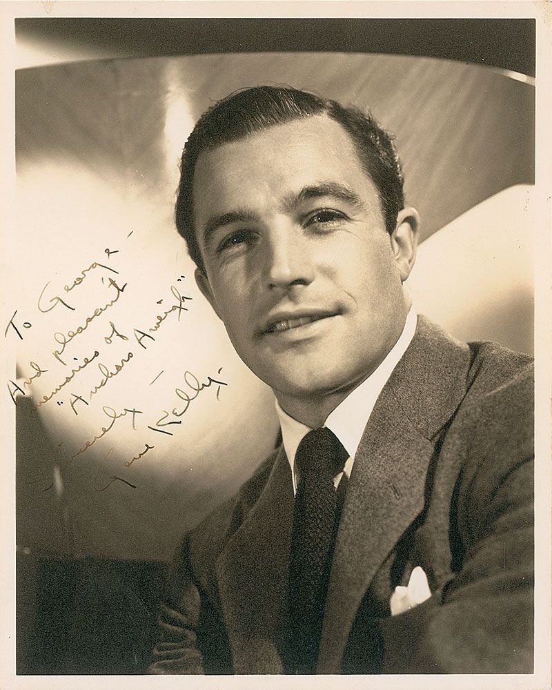 Vintage matte-finish 8 x 10 photo, signed and inscribed in fountain pen to assistant director George Rhein, “To George—And pleasant memories of ‘Anchors Aweigh’ Sincerely—Gene Kelly.” In fine condition, with some light contrast to small portions of signature and inscription and some mild edge rippling.
