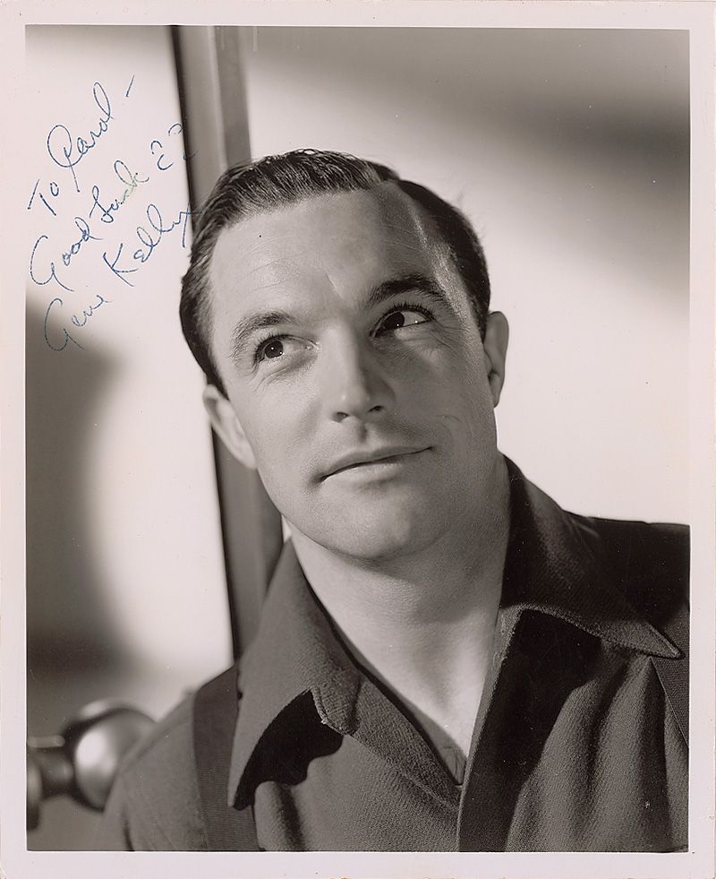 Vintage glossy 8 x 10 photo, signed and inscribed in blue ballpoint “To Carol—Good Luck, Gene Kelly.” In very good condition, with scattered creases, surface marks, and impressions, and some light skipping and a brush to signature and inscription.