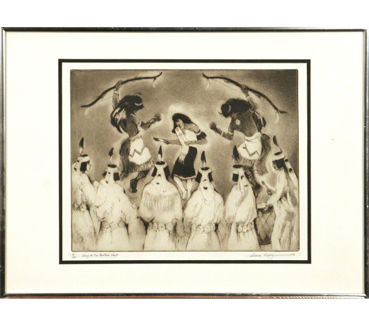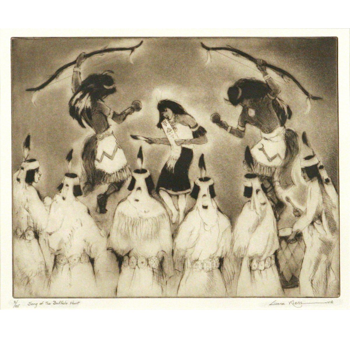 Gene Kloss (1903 - 1996). Song of the Buffalo Hunt, 1979. 10.75" x 14.75" etching. Pencil signed in lower margin: 2/25 Song of the Buffalo Hunt. Gene Kloss N.A.