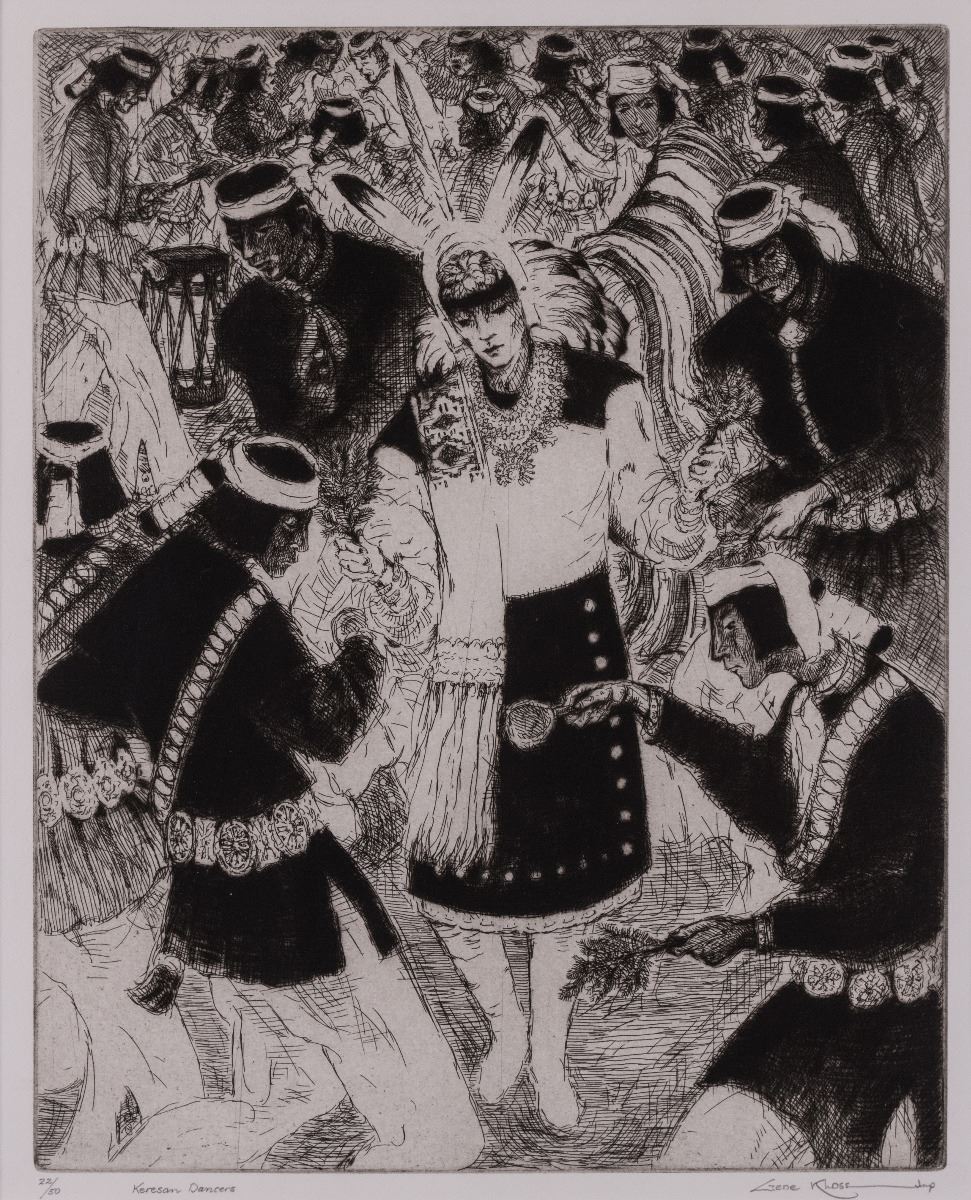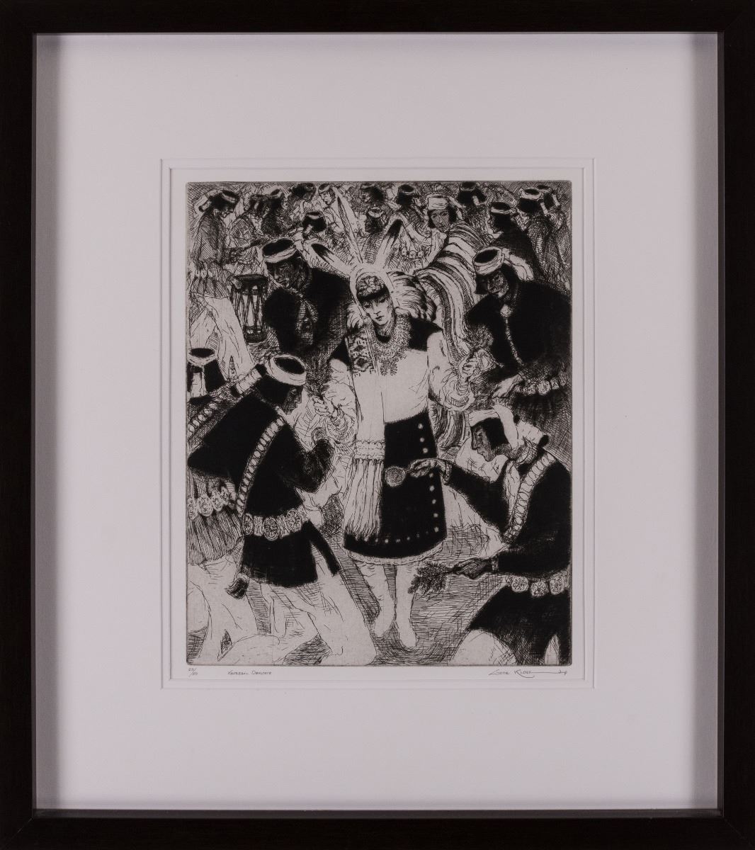 Gene Kloss (1903-1996). Keresan Dancers. 13 ¾" x 10 ¾" etching. Signed lower right, titled and numbered 22/50 lower left.