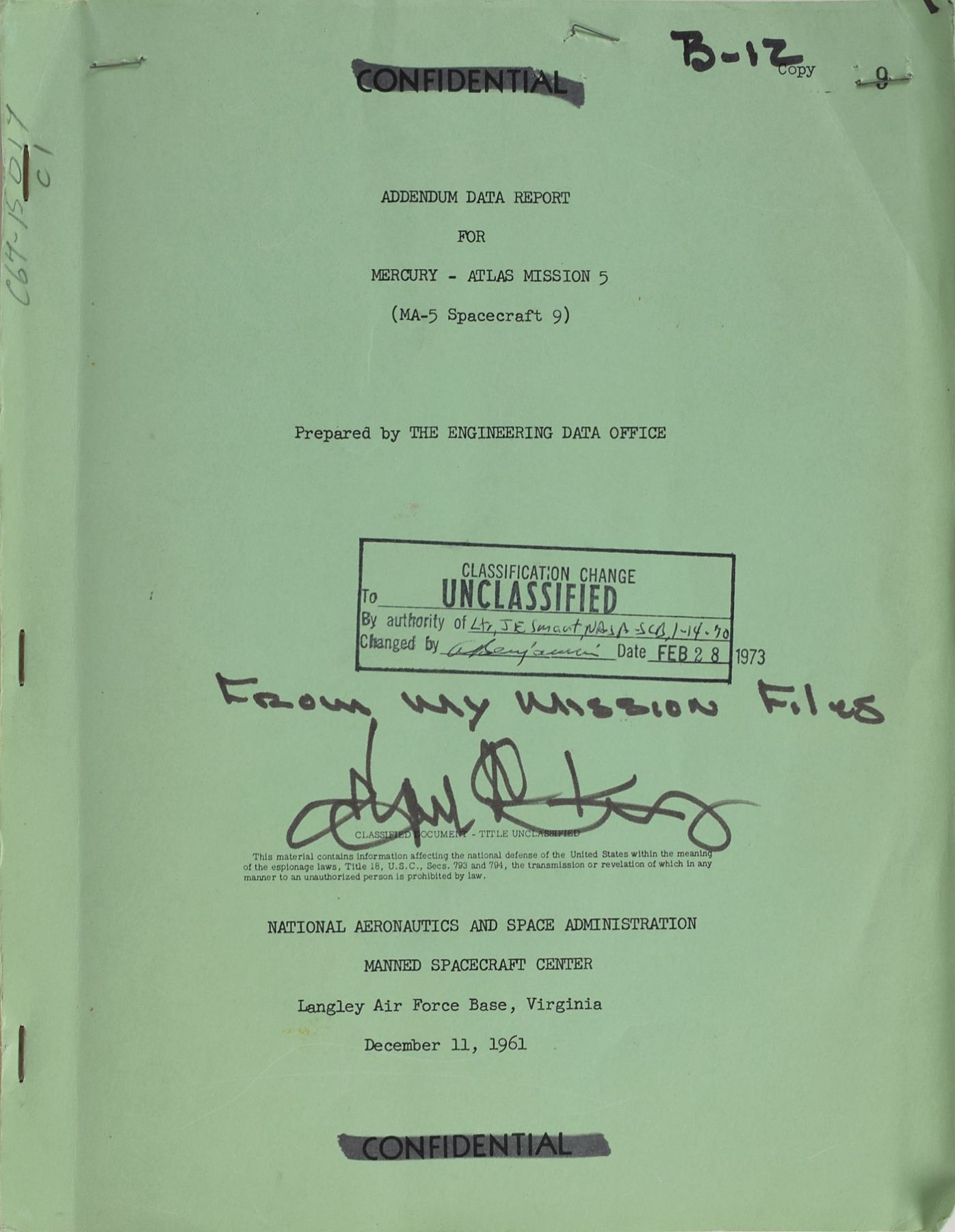 Gene Kranz's personally used "Addendum Data Report for Mercury–Atlas Mission 5 (MA–5 Spacecraft 9)," as prepared by the Engineering Data Office, consisting of a total of 146 figures (many folded), 8.5 x 10.5, December 11, 1961, signed on the front cover in black felt tip, "From my mission files, Gene Kranz." This report is a supplement to the Postlaunch Memorandum Report of the Mercury–Atlas Mission No. 5 (reference 1). It is a compilation of time histories of quantities measured onboard the capsule during the flight and recorded on an onboard tape recorder. The figures relate to: "Automatic stabilization and control system," "Reaction control system," "Electrical system," "Command receivers," "Environmental control system," "External temperatures," "Pressures," "Accelerations," "Yaw data converter," "Temperature survey," "Spacecraft axis and diagram," and "Spacecraft instrumentation system block diagram." The word "Confidential" has been covered in black felt tip on all pages and covers, with the front marked: "B–12." In fine condition, with expected handling wear.