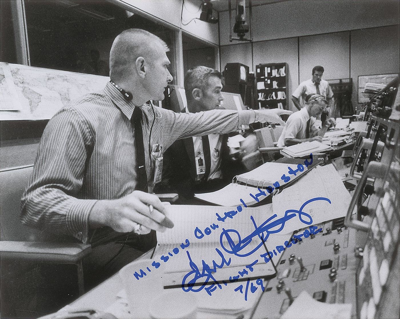 Satin-finish 10 x 8 photo of Kranz at his Mission Control console during Apollo 11, signed in blue felt tip, "Mission Control Houston, Eugene F. Kranz, Flight Director, 7/69." In very fine condition.