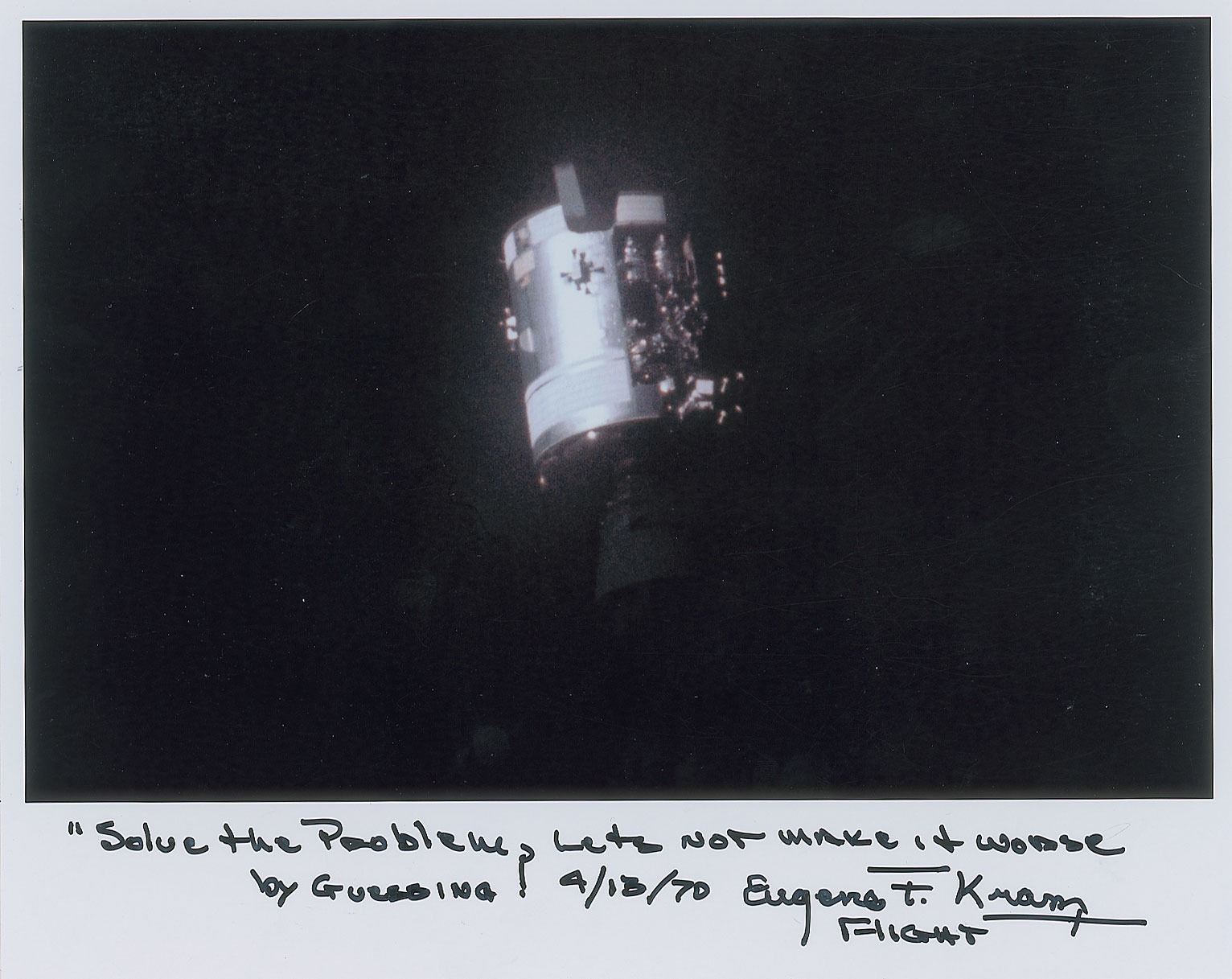 Color glossy 10 x 8 photo of the damaged Apollo 13 capsule, signed in the lower border in black felt tip, "'Solve the problem, let's not make it worse by guessing!' 4/13/70, Eugene F. Kranz, Flight." In very fine condition.