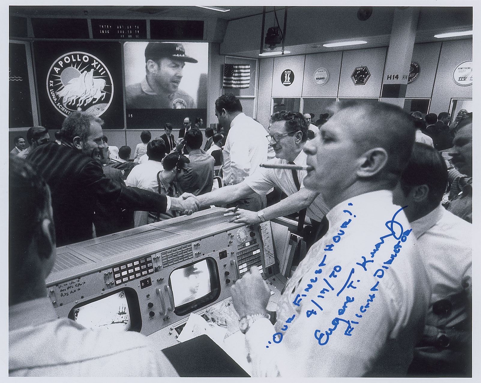 Glossy 10 x 8 photo of mission control following the successful splashdown and recovery of the Apollo 13 crew, with Gene Kranz smoking a cigar and Commander James Lovell on the screen in the background, signed in blue felt tip, "'Our finest hour!' 4/17/70, Eugene F. Kranz, Flight Director." In very fine condition.