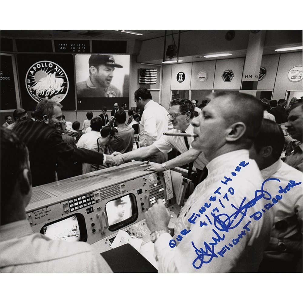 Satin-finish 10 x 8 photo of mission control following the successful splashdown and recovery of the Apollo 13 crew, with Gene Kranz smoking a cigar and Commander James Lovell on the screen in the background, signed in blue felt tip, "Our finest hour, 4/17/70, Eugene F. Kranz, Flight Director." In very fine condition.