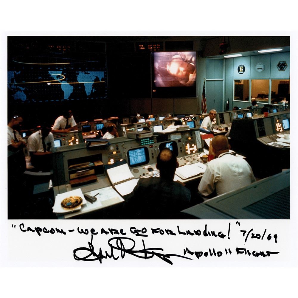 Color glossy 10 x 8 photo of the Mission Control Center in Houston during Apollo 11, boldly signed in the lower border in black felt tip, "'Capcom—we are go for landing!' 7/20/69, Eugene F. Kranz, Apollo 11 Flight." In fine condition.