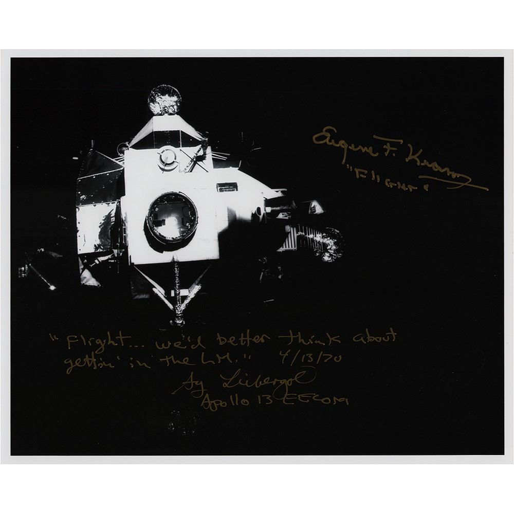 Satin-finish 10 x 8 photo of the disabled Apollo 13 capsule, signed in gold ink, "Eugene F. Kranz, 'Flight,'" and "'Flight…we'd better think about gettin' in the LM.' 4/13/70, Sy Liebergot, Apollo 13 EECOM." In fine condition.