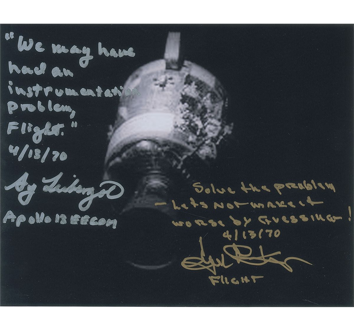 Satin-finish 10 x 8 photo of the Apollo 13 capsule, signed in gold ink, “Solve the problem—Lets not make it worse by guessing! 4/13/70, Gene Kranz, Flight,” and in silver ink, “‘We may have had an instrumentation problem, Flight.’ 4/13/70, Sy Liebergot, Apollo 13 EECOM.” In fine condition, with a slightly grainy quality to the image.