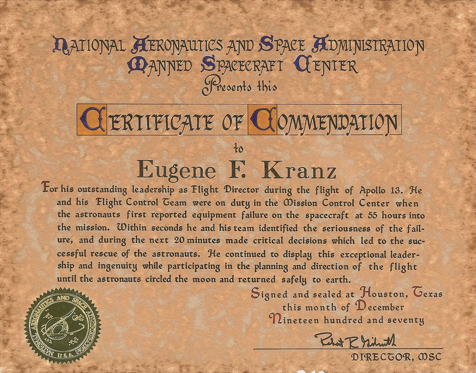 Amazing NASA–Manned Spacecraft Center "Certificate of Commendation" presented to lead flight director "Eugene F. Kranz," 14 x 11, with printed text reading: "For his outstanding leadership as Flight Director during the flight of Apollo 13. He and his Flight Control Team were on duty in the Mission Control Center when the astronauts first reported equipment failure on the spacecraft at 55 hours into the mission. Within seconds he and his team identified the seriousness of the failure, and during the next 20 minutes made critical decisions which led to the successful rescue of the astronauts. He continued to display this exceptional leadership and ingenuity while participating in the planning and direction of the flight until the astronauts circled the moon returned safely to earth." Lower portion bears a gold foil NASA seal and a preprinted signature of Robert R. Gilruth, the first director of NASA's Manned Spacecraft Center. In very good to fine condition, with overall mottling, heavier to the edges, and trivial chipping to bottom edge.