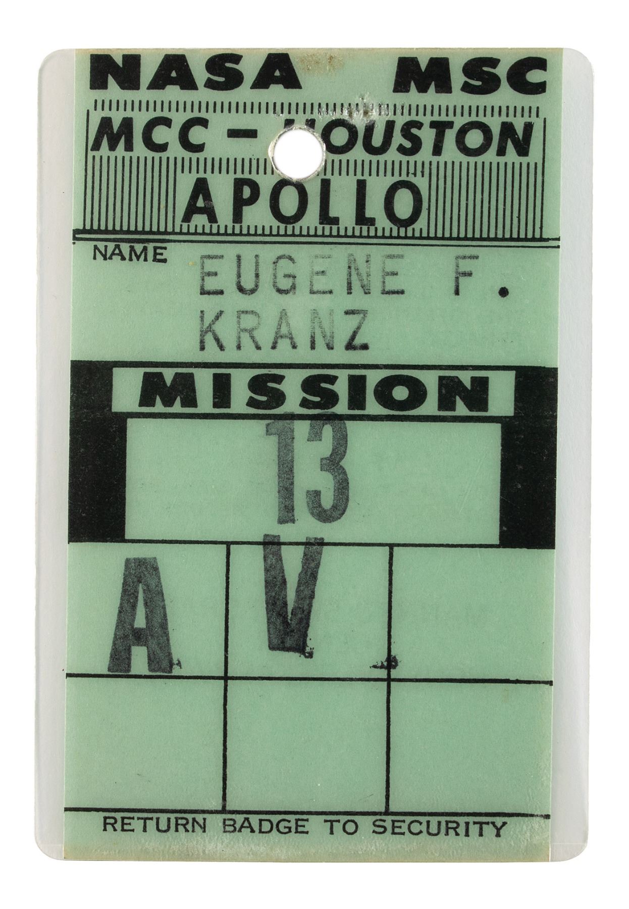 Gene Kranz's green laminated NASA Mission Control Center access badge, 2.5 x 3.75, issued to "Eugene F. Kranz" for the Apollo 13 mission and stamped "AV." In fine condition. Accompanied by a signed letter of authenticity from Kranz, which reads, in full: "The Apollo 13 MCC badge issued in my name that accompanies this letter is from my personal collection of space memorabilia. Since its acquisition and prior to being offered for sale through Farthest Reaches Inc., it has remained continuously in my possession. I entrust you to preserve this authentic piece of manned space program history and hope that you and others will enjoy it for years to come. It should serve as a constant reminder of not only our accomplishments during this period but of the personal sacrifice that allowed us to forge a path from the Earth to the Moon and beyond." After serving as a flight director for each of the Gemini missions, Kranz was selected as division chief for Flight Control in 1968, working in the same capacity for all odd-numbered Apollo missions, including both Apollo 11 and Apollo 13. As the leader of the ‘Tiger Team’ of flight directors, Kranz showed incredible resilience and ingenuity when confronted with the task of bringing the crew of Apollo 13 safely back to Earth.