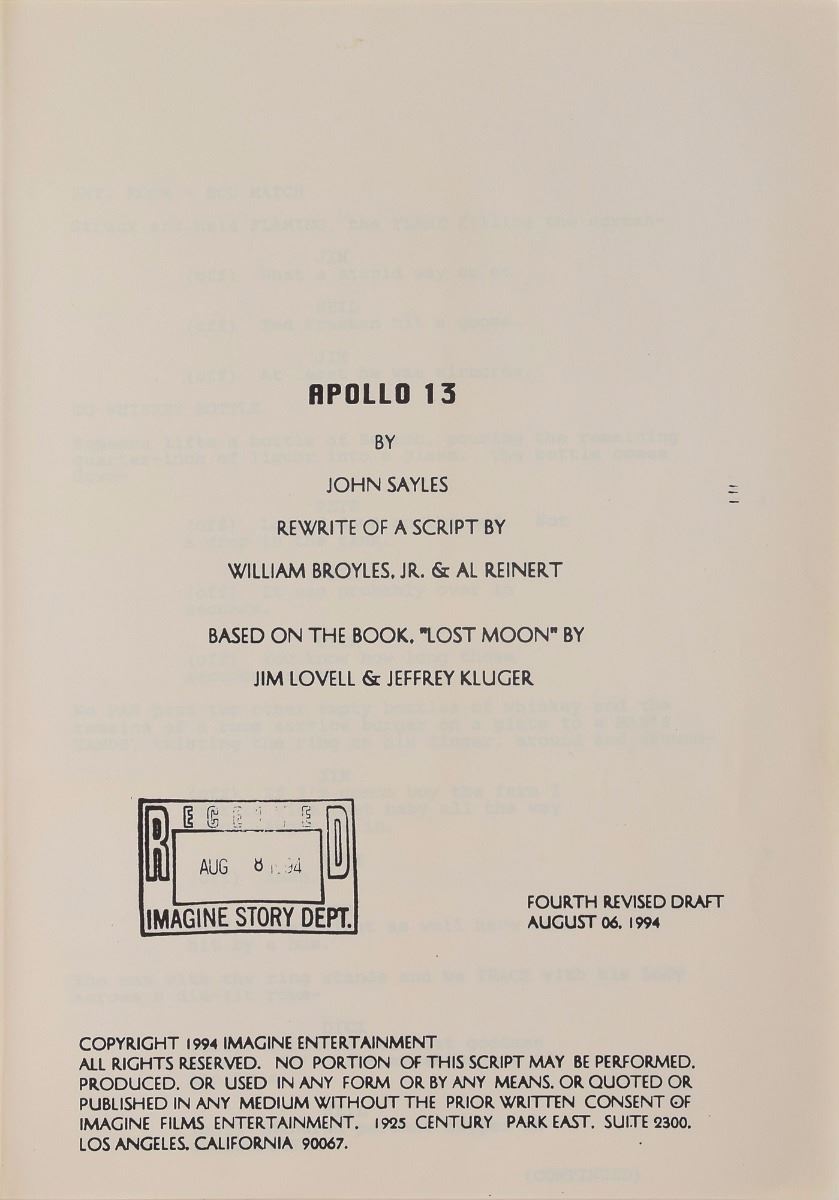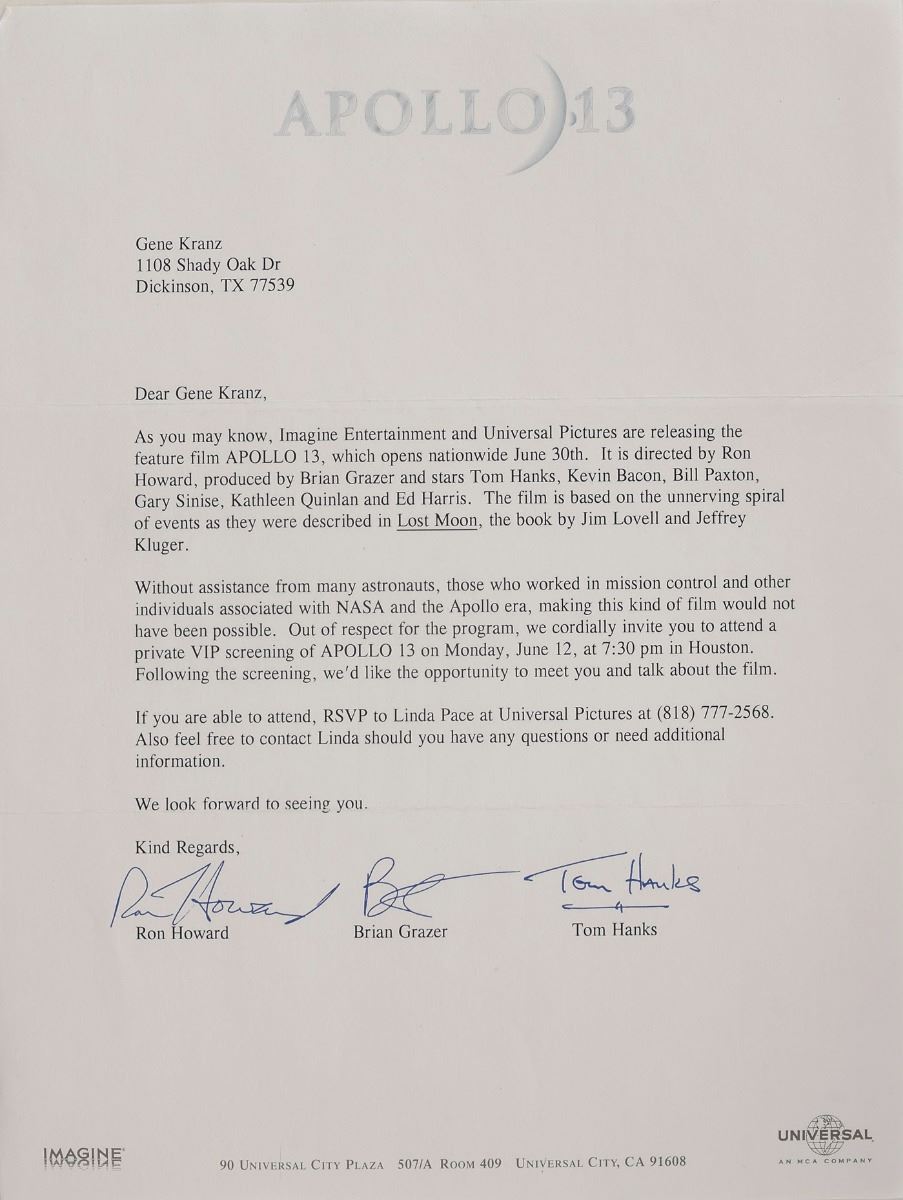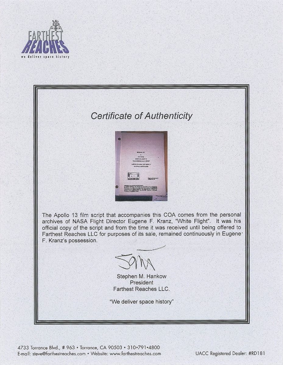 Gene Kranz's brad-bound Imagine Entertainment typescript for the film Apollo 13, fourth revised draft, 8.75 x 11.25, 141 pages, stamp-dated August 8, 1994. Includes a typed letter bearing preprinted signatures of Ron Howard, Brian Grazer, and Tom Hanks, inviting Kranz to a screening, in part: "Without assistance from many astronauts, those who worked in mission control and other individuals associated with NASA and the Apollo era, making this kind of film would not have been possible. Out of respect for the program, we cordially invite you to attend a private VIP screening of APOLLO 13 on Monday, June 12, at 7:30 pm in Houston. Following the screening, we'd like the opportunity to meet you and talk about the film." Also included is a follow-up letter with information for the event schedule, as well as a letter relating to a "Release to Portray Form" intended for Kranz; the unsigned form is included. In overall fine condition. Accompanied by a certificate of authenticity from Farthest Reaches. Based on the book Lost Moon: The Perilous Voyage of Apollo 13, Ron Howard’s film adaptation of the third lunar-landing mission proved to be a major critical and box office success, and was awarded with nine Oscar nominations. Actor Ed Harris, who portrayed flight director Gene Kranz in the film, earned a Best Supporting Actor nomination for his performance.