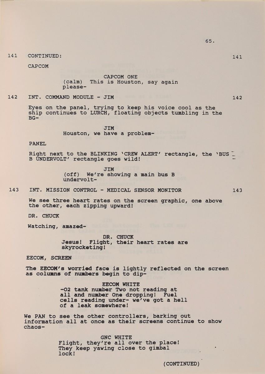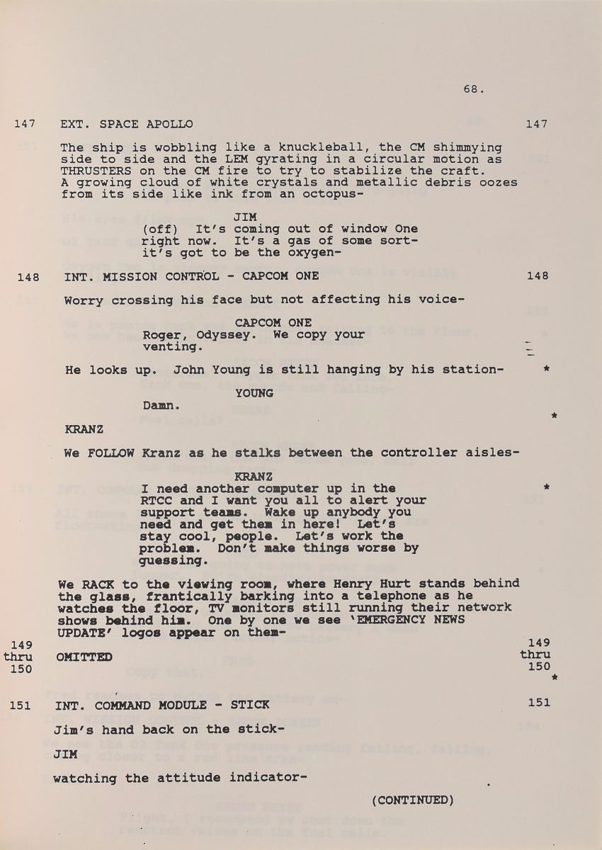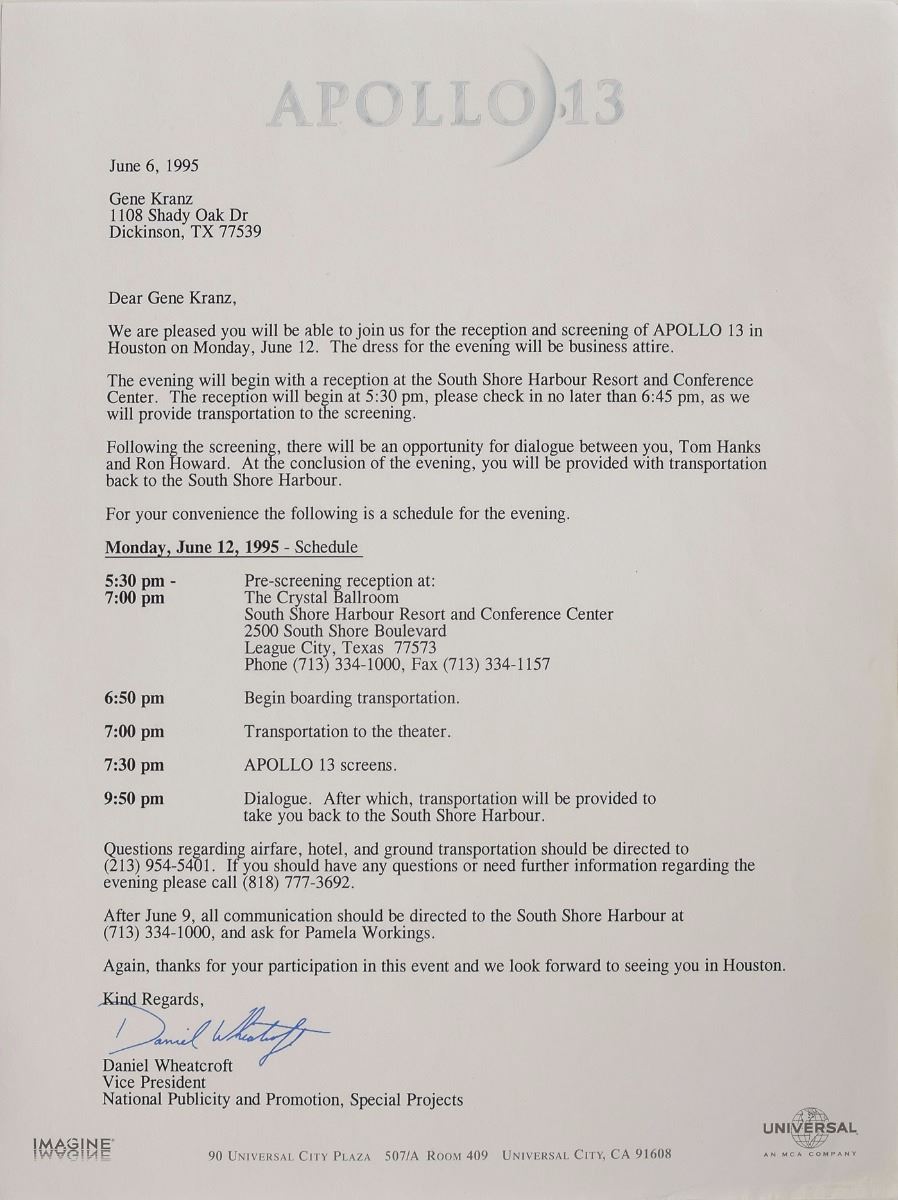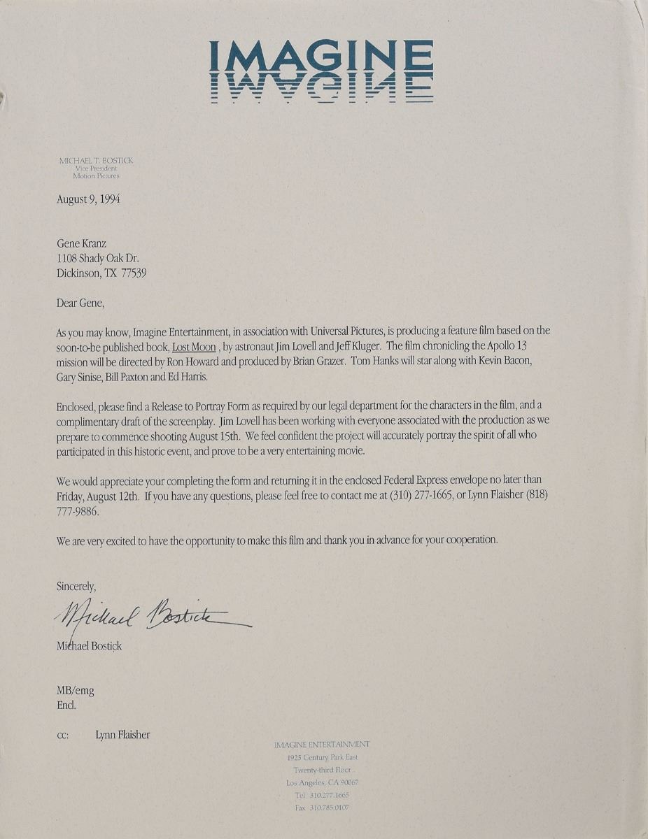 Gene Kranz's brad-bound Imagine Entertainment typescript for the film Apollo 13, fourth revised draft, 8.75 x 11.25, 141 pages, stamp-dated August 8, 1994. Includes a typed letter bearing preprinted signatures of Ron Howard, Brian Grazer, and Tom Hanks, inviting Kranz to a screening, in part: "Without assistance from many astronauts, those who worked in mission control and other individuals associated with NASA and the Apollo era, making this kind of film would not have been possible. Out of respect for the program, we cordially invite you to attend a private VIP screening of APOLLO 13 on Monday, June 12, at 7:30 pm in Houston. Following the screening, we'd like the opportunity to meet you and talk about the film." Also included is a follow-up letter with information for the event schedule, as well as a letter relating to a "Release to Portray Form" intended for Kranz; the unsigned form is included. In overall fine condition. Accompanied by a certificate of authenticity from Farthest Reaches. Based on the book Lost Moon: The Perilous Voyage of Apollo 13, Ron Howard’s film adaptation of the third lunar-landing mission proved to be a major critical and box office success, and was awarded with nine Oscar nominations. Actor Ed Harris, who portrayed flight director Gene Kranz in the film, earned a Best Supporting Actor nomination for his performance.