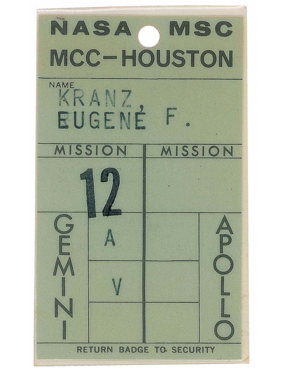 Kranz’s laminated badge for the NASA Manned Spacecraft Center, Mission Control Center-Houston, 2.25 x 3.75, stamped with his name, “Kranz, Eugene F.,” noting the mission as Gemini “12,” with “A” and “V” stamped below. In fine condition. Accompanied by a signed letter of authenticity from Kranz, in part: “The Gemini 12 MCC badge issued in my name that accompanies this letter, is from my personal collection of space memorabilia.” Gemini 12 was the final manned mission of the Gemini program, in which James Lovell and Buzz Aldrin performed a rendezvous and docking with the Agena target vehicle and Aldrin completed three EVAs.
