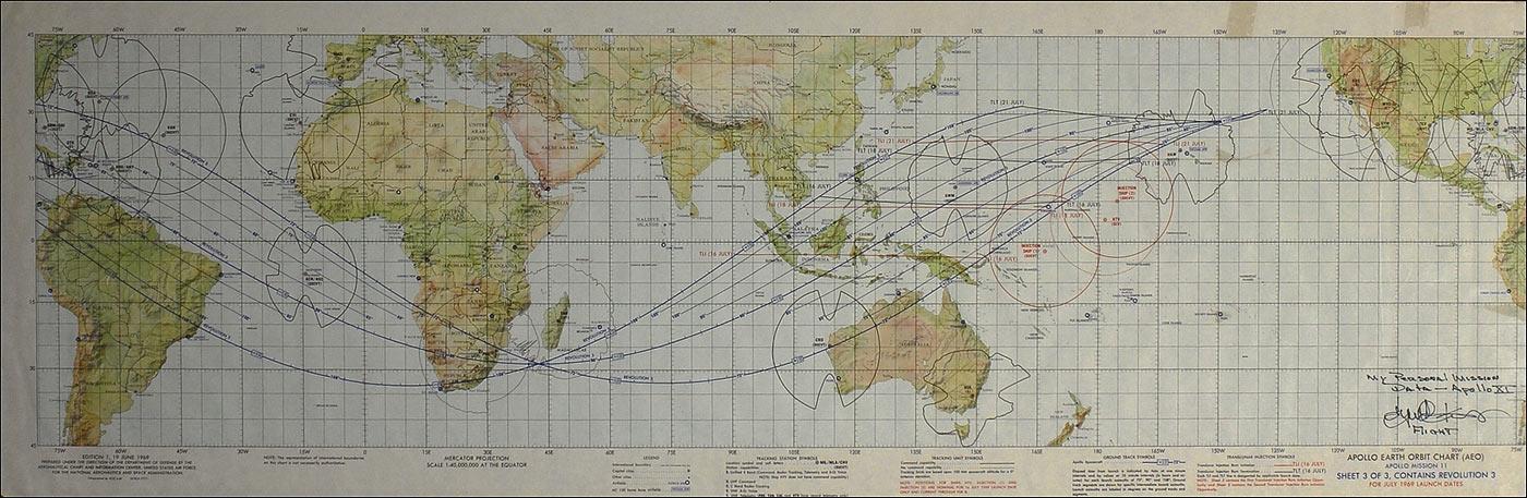Apollo 11 Earth orbit map, used by Gene Kranz in his role as Flight Director of the Apollo 11 mission. Color map measures 41 x 13.5 and is titled in the lower border, “Apollo Earth Orbit Chart (AEO), Apollo Mission 11, Sheet 3 of 3, Contains Revolution 3.” Chart is signed in the lower right corner, “My personal mission data—Apollo XI, Gene Krantz, Flight.” Chart shows the third revolution of the Apollo 11 module with several start and end points for the Translunar Injection Burn Initiation and the Translunar Injection Burn Termination, all ending in the general vicinity of Hawaii on July 16, 1969. Rolled and in fine condition, with some mild handling wear as well as a few light squares of toning from tape on reverse. Accompanied by a photo of Kranz holding the map after signing.