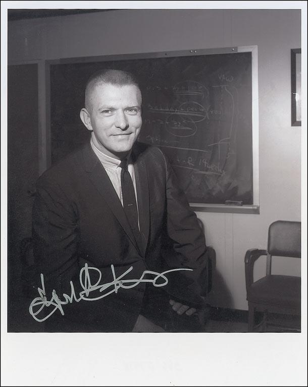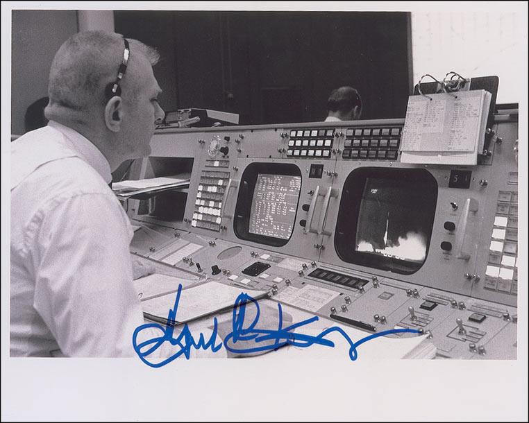 Two satin-finish photos, one 8 x 10 of Gene Kranz in a suit and tie posing in front of a black board, signed in silver ink; and one 10 x 8 of Kranz at NASA Mission Control, signed in blue felt tip. In fine condition.