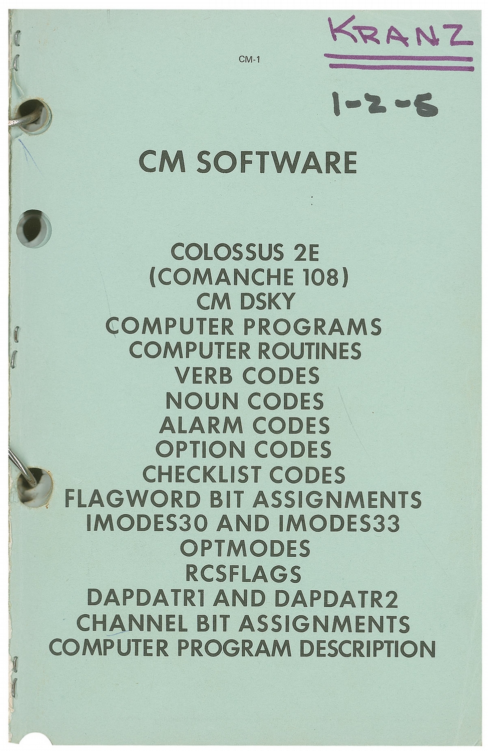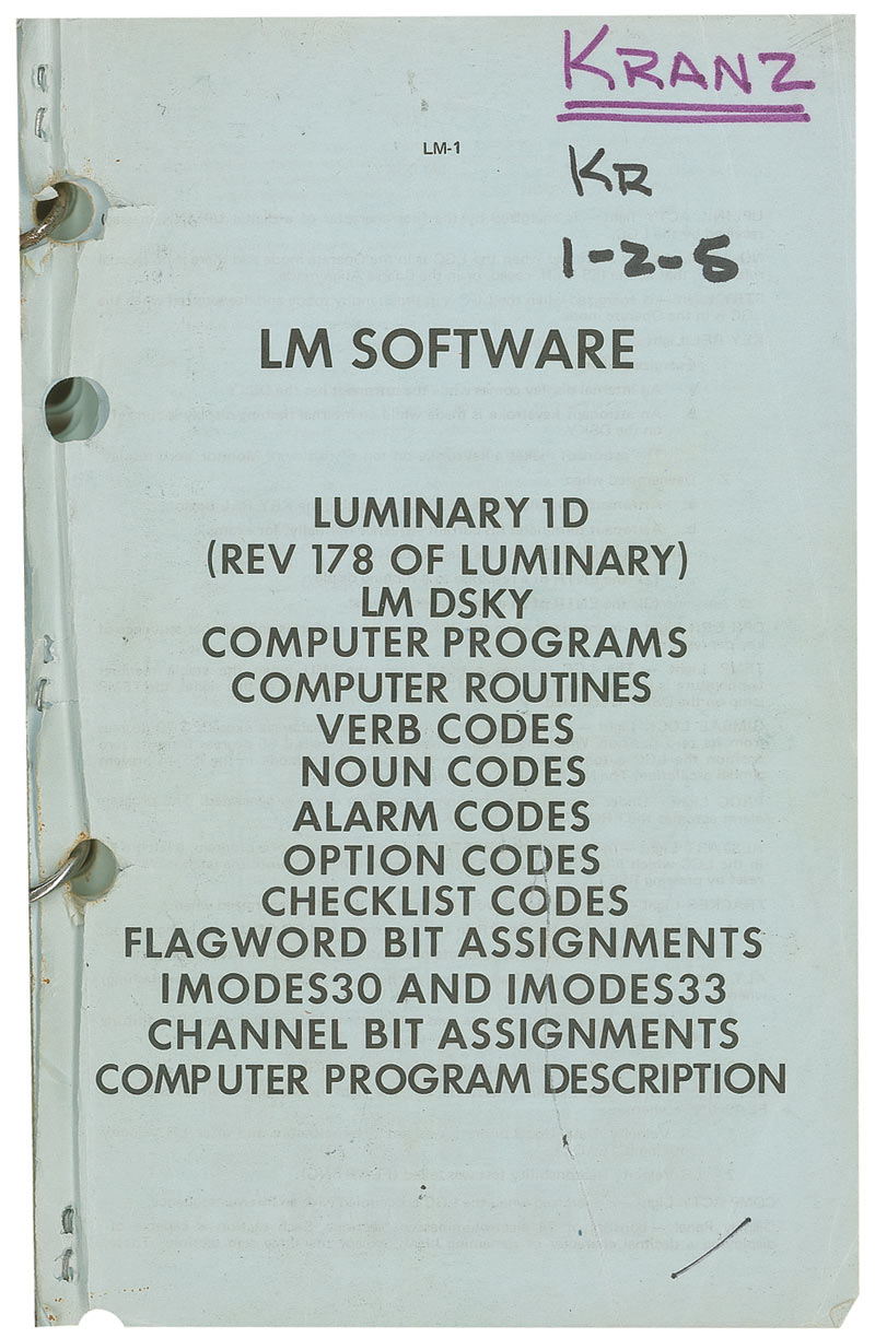 Two software ‘Goody’ books, each 5.5 x 8.5, used by Gene Kranz throughout the Apollo program from his Flight Director's console. These software manuals contain the codes that represent to key to understanding the computer operating systems for both the Lunar Module (entitled “Luminary 1D”) and Command Module (entitled “Colossus 2E”) for every manned mission, including Apollo 11. They are the actual computer manuals for the computer systems of the lunar module and command module. In order to keep these software books close at hand, Gene attached them to his console by way of two still-intact rings. Accompanied by a letter of authenticity from Kranz that reads in part, “The Apollo CM & LM Goody Books pictured above come from my personal space memorabilia archives. I kept these important reference materials at my console throughout the Apollo program. They were utilized for every manned mission.”
