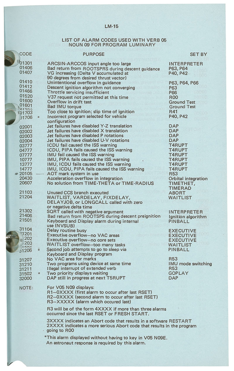 The so-named ‘goody book’ was used by mission control officials to access critical or often-used information more quickly and efficiently. Interestingly, page LM-15 of this goody book shows the infamous 1202 Alarm Code—a program alarm from the guidance computer signaling an ‘executive overflow,’ meaning the computer might not be keeping up with its tasks. As the lunar module passed 35,000 feet above the moon, the capsule’s computer display began to sound a warning, with Buzz Aldrin quickly determining the problem and leading Neil Armstrong to ask mission control, ‘Give us a reading on the 1202 Program Alarm.’ As the mission commander waited to see whether an abort was imminent, engineers on Earth concluded that the warning would have no impact on the landing, and that high-priority computing tasks were still being completed. NASA guidance officer Steve Bales notified Kranz, ‘We’re go on that alarm,’ deciding not to abort the lunar landing and completing the historic journey. An incredibly significant and truly wonderful slice of manned space program history from one of its key players.