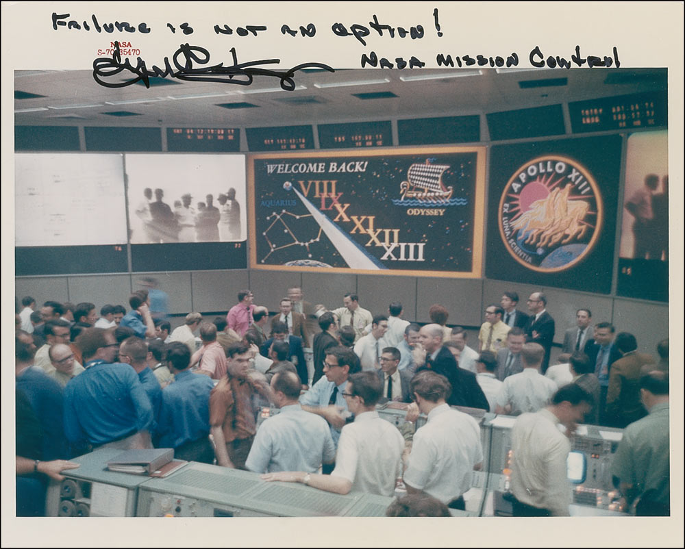 Color glossy 10 x 8 ‘red-numbered’ NASA photo of a jubilant mission control after the safe return of Apollo 13, signed in black felt tip, “Failure is not an option! Gene Kranz, NASA Mission Control.” In fine condition, with a couple trivial corner tip creases.