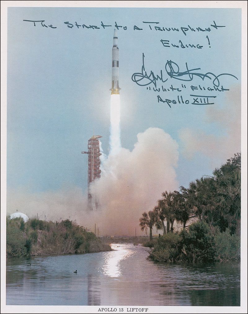 Color 8 x 10 NASA photo of the Apollo 13 launch, signed in black felt tip, “The Start of a Triumphant Ending! Gene Kranz, ‘White’ Flight, Apollo XIII.” In fine condition.