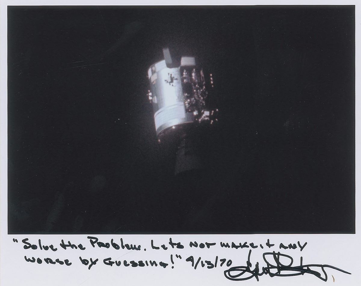Glossy 10 x 8 photo of the Apollo 13 capsule, signed in the lower border in black felt tip, “‘Solve the problem. Let’s not make it any worse by guessing!’ 4/13/70, Gene Kranz.” In fine condition.