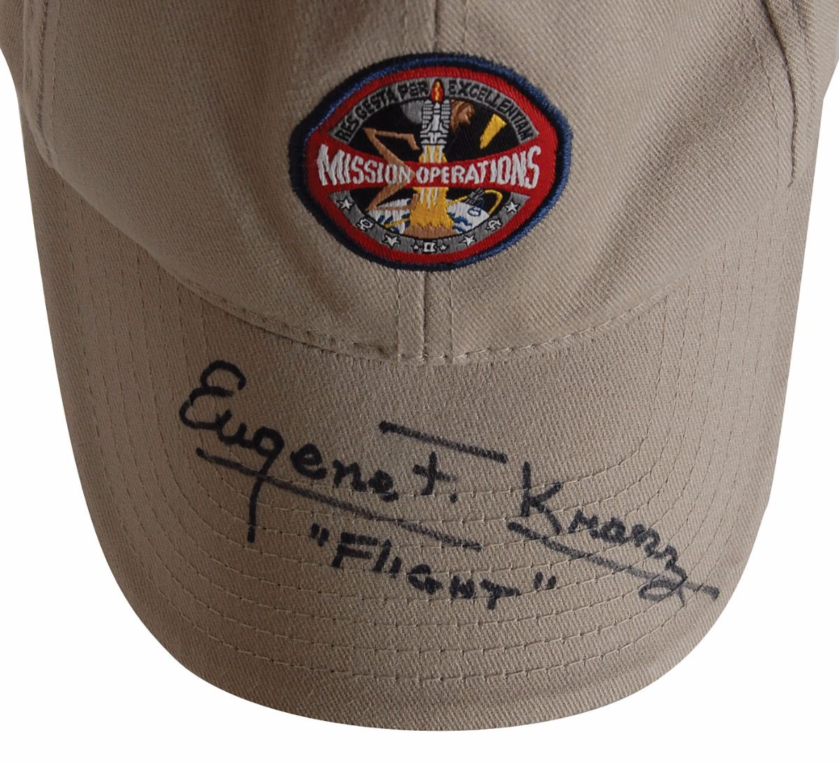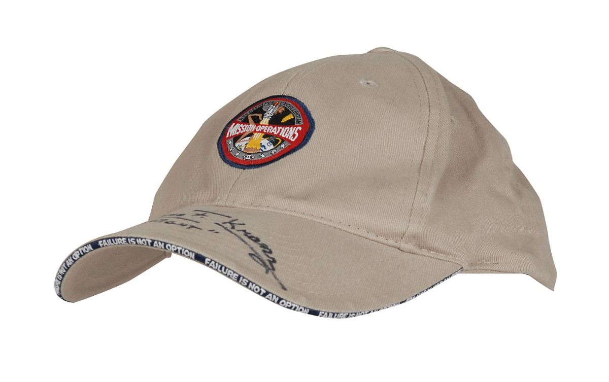 Official NASA Mission Operations baseball cap, signed on top of the bill in black felt tip, “Eugene F. Kranz, ‘Flight.’” In fine condition. From the collection of Gene Kranz and accompanied by a letter of authenticity from Farthest Reaches.