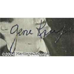 <B>Gene Krupa Signed Window Card.</B></I> Gene Krupa came out of the rich musical talent pool that existed in the Chicago of the 1920's. He cut his first record in 1927, with a band put together by Eddie Condon. In 1934, Krupa joined Benny Goodman's new orchestra and became a star. Krupa is probably single-handedly responsible for making the drum a popular solo instrument during the swing era. His work on the recording "Sing, Sing, Sing" may be the best example of this. Gene eventually formed his own band, which enjoyed great success, but he always returned to reunion performances with Goodman's small group. This card features a nice photo of Krupa at his drums, ands he has signed on his image. Small corner pinholes would matte or frame out. <I>Accompanied by COA from Jazz & Big Band expert Larry Rafferty.</B></I> <BR><BR><B>Important notice:</B> Heritage usually auctions material at the rate of 200-250 lots per hour. On some occasions eBay Live bid software or the Internet may not be able to keep up with the pace of the auction. We recommend placing a realistic absentee bid now as insurance to avoid disappointment. Occasionally the auctioneer may eliminate or reject an eBay Live bid, and the auctioneer may also reopen a lot after the close of the eBay live bidding (usually because we missed an audience bid), and may reject your bid even if it shows you as the winning bidder. By bidding via eBay Live, you agree that Heritage may award the lot to another bidder at its sole discretion under the circumstances described above or any other reasonable circumstances. Since eBay bids are not shown to us until we open the lot on the floor, we treat those bids just like floor bids. In most cases the floor responds before the eBay bid is presented to us, due to Internet lag time, so for consistency we have made it a policy that floor bids are always considered first over tie eBay live bids. Also please note that all Heritage lots purchased through eBay Live carry a 24.5% Buyer's Premium. Please make sure you read the Terms and Conditions before you bid.