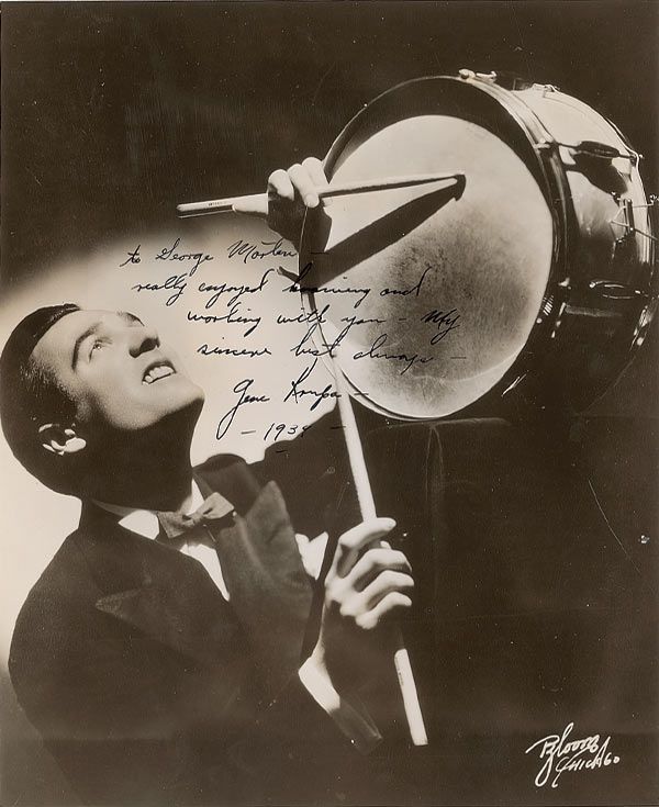 Vintage glossy 7 x 8.5 photo, signed and inscribed in fountain pen “To George Morten—really enjoyed having and working with you. My sincere best always—Gene Krupa—1939—.” In very good condition, with trimmed edges, some scattered light creases and surface marks, and a few impressions from writing on reverse.