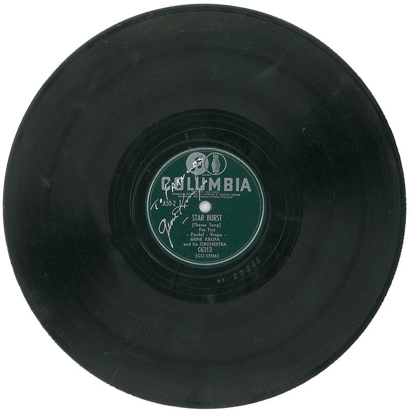 Original Columbia ‘Star Burst/Sunrise Serenade’ album signed and inscribed on the label in white ink, “To Frances, Gene Krupa.” In fine condition. Consignor notes that this item dates to 1947. A 78 rpm record, such as this, in near-perfect condition is quite rare and desirable.