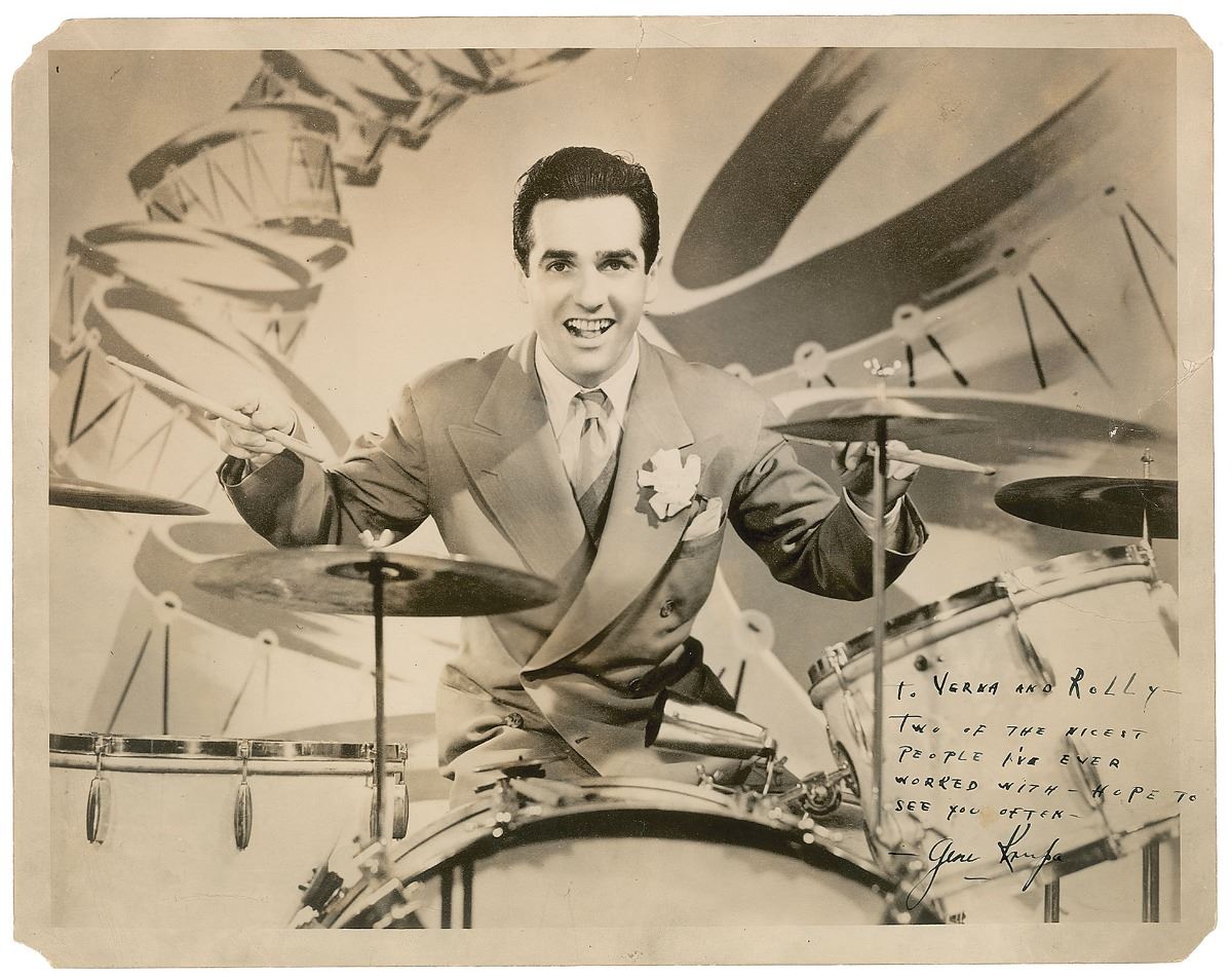 Vintage matte-finish 14 x 11 photo of Krupa drumming away, signed and inscribed in fountain pen, “Verna and Rolly—Two of the nicest people I’ve ever worked with—hope to see you often—Gene Krupa.” In very good to fine condition, with creasing, a few small edge tears, and clipped corners.
