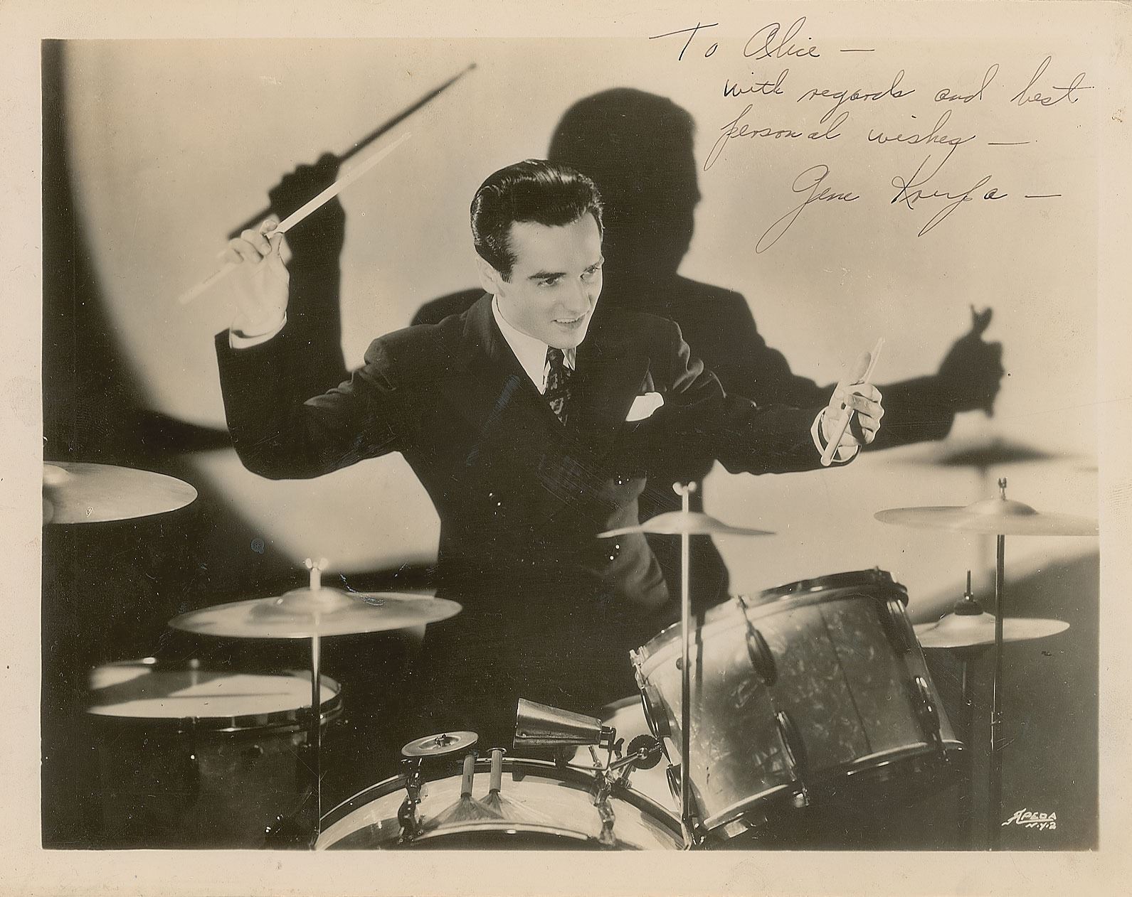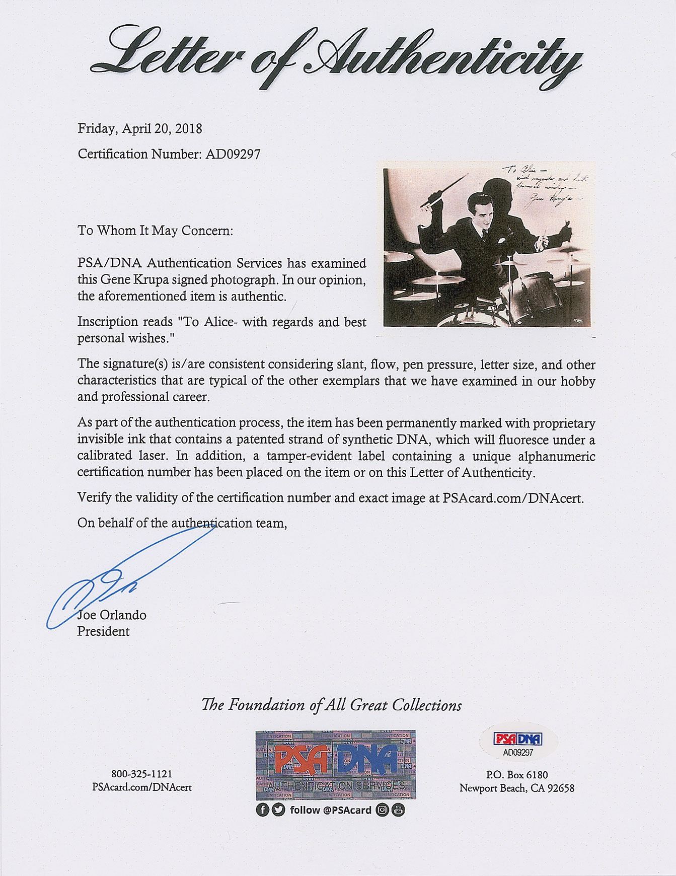 Vintage glossy 10 x 8 photo of the great jazz drummer, signed and inscribed in fountain pen, "To Alice—with regards and best personal wishes—Gene Krupa." In very good to fine condition, with scattered small creases, and light silvering to the darker areas of the image. Accompanied by a full letter of authenticity from PSA/DNA.