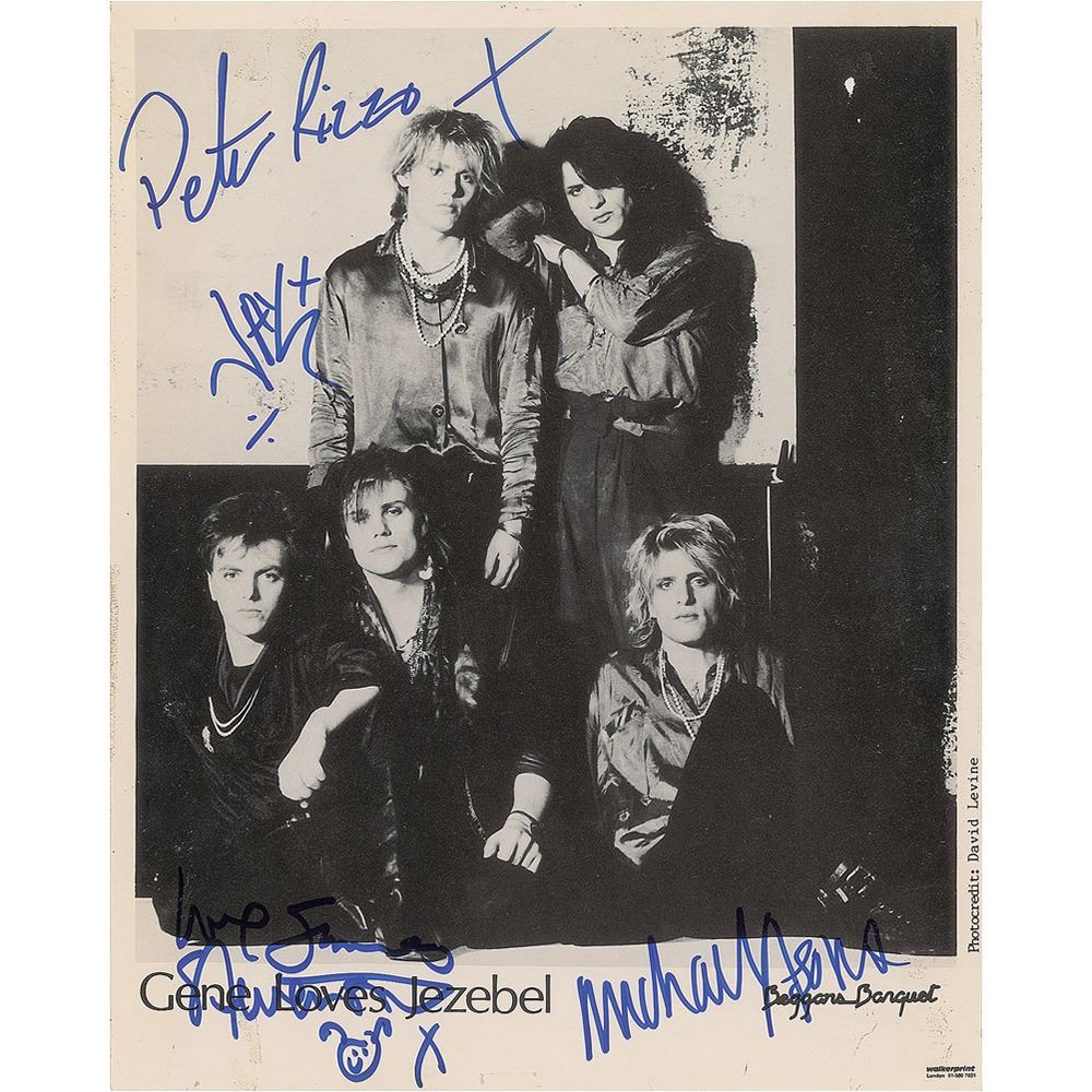 Cardstock 8 x 10 Beggar's Banquet Records publicity photo of the British rock group Gene Loves Jezebel, signed in blue felt tip by Jay Aston, Michael Aston, Pete Rizzo, and James Stevenson. In fine condition, with light scattered surface impressions and tape remnants to the reverse.