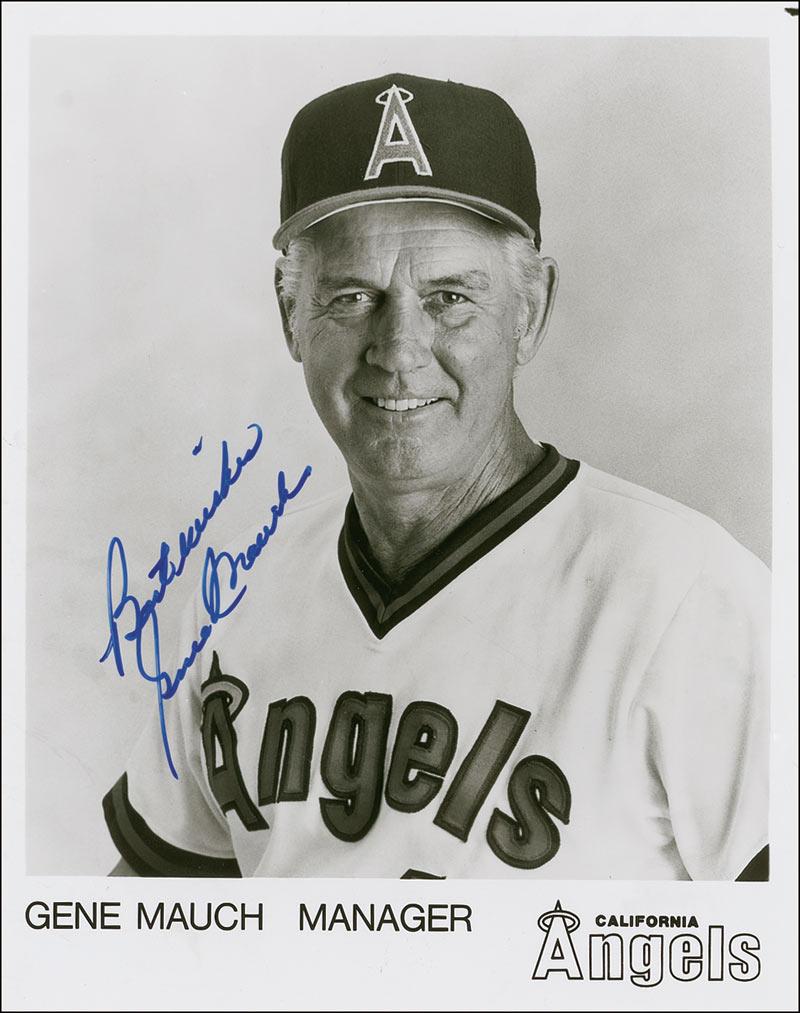 Longtime MLB player and manager (1925–2005) and the winningest manager to have never won a league pennant. Glossy 8 x 10 California Angels publicity photo of Mauch as manager, signed in blue felt tip. In fine condition.