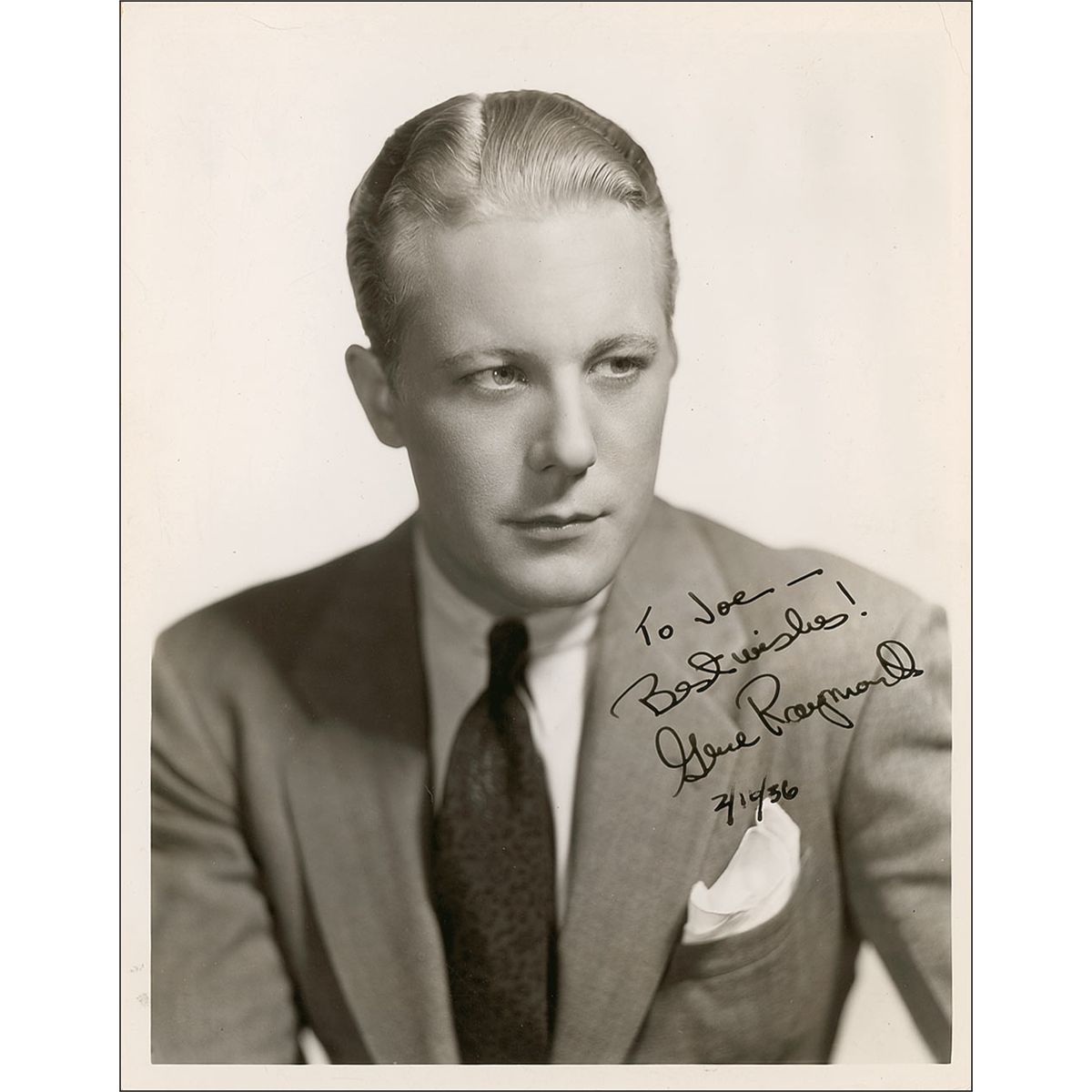 Distinguished vintage glossy 8 x 10 Columbia Pictures photo of Raymond in a suit and tie, signed and inscribed in fountain pen, “To Joe—Best wishes! Gene Raymond, 2/16/36.” In fine condition, with scattered light surface creasing and some light rippling to the finish.