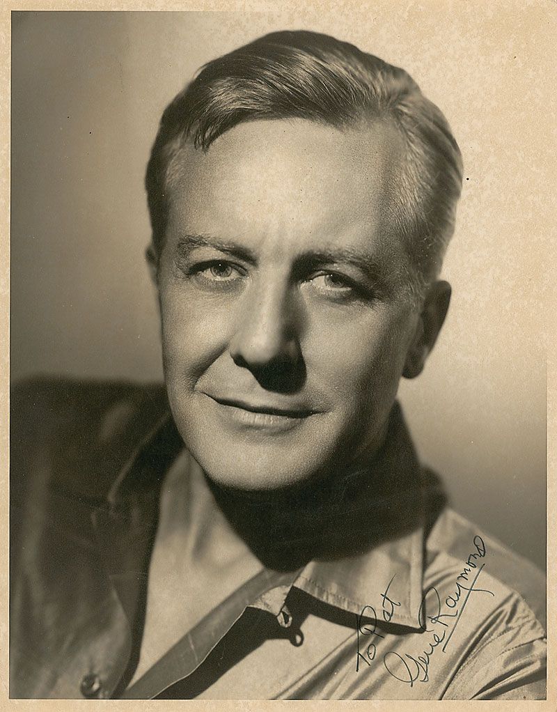 Matte-finish 11 x 14 photo, signed and inscribed in black felt tip “To Pat, Gene Raymond.” A few light creases and ripples along bottom edge and some mild spotting to background, otherwise fine condition.