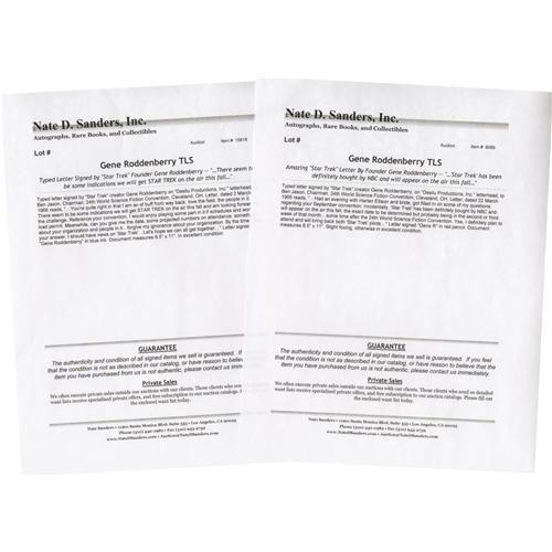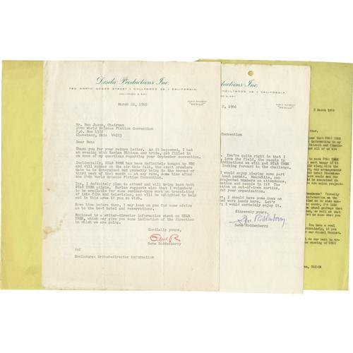<B>Important Gene Roddenberry Signed Letters Regarding Star Trek (1966).</B></I> A great pair of letters written by Roddenberry to World Science Fiction Convention chairman Ben Jason, both on Desilu Productions Inc. letterhead and signed by Roddenberry. In the first letter, dated March 2, 1966, Roddenberry writes: "There seems to be some indication we will get 'Star Trek' on the air this fall...", and in the second letter, dated March 22, 1966, he declares: " 'Star Trek' has been definitely bought by NBC and will appear on the air this fall...". Little did he realize that the series would go on to become both an international phenomenon and one of the most successful entertainment franchises in history. The letters are in Very Fine condition with mild wear and staining, fold creases to one, and punch in the top edge of the other. <I>Accompanied by LOA from PSA/DNA.</B></I><BR><BR><b>Shipping:</b> Flat Material, Small (<a target="_blank" href="http://www.heritageauctions.com/common/shipping.php">view shipping information</a>)