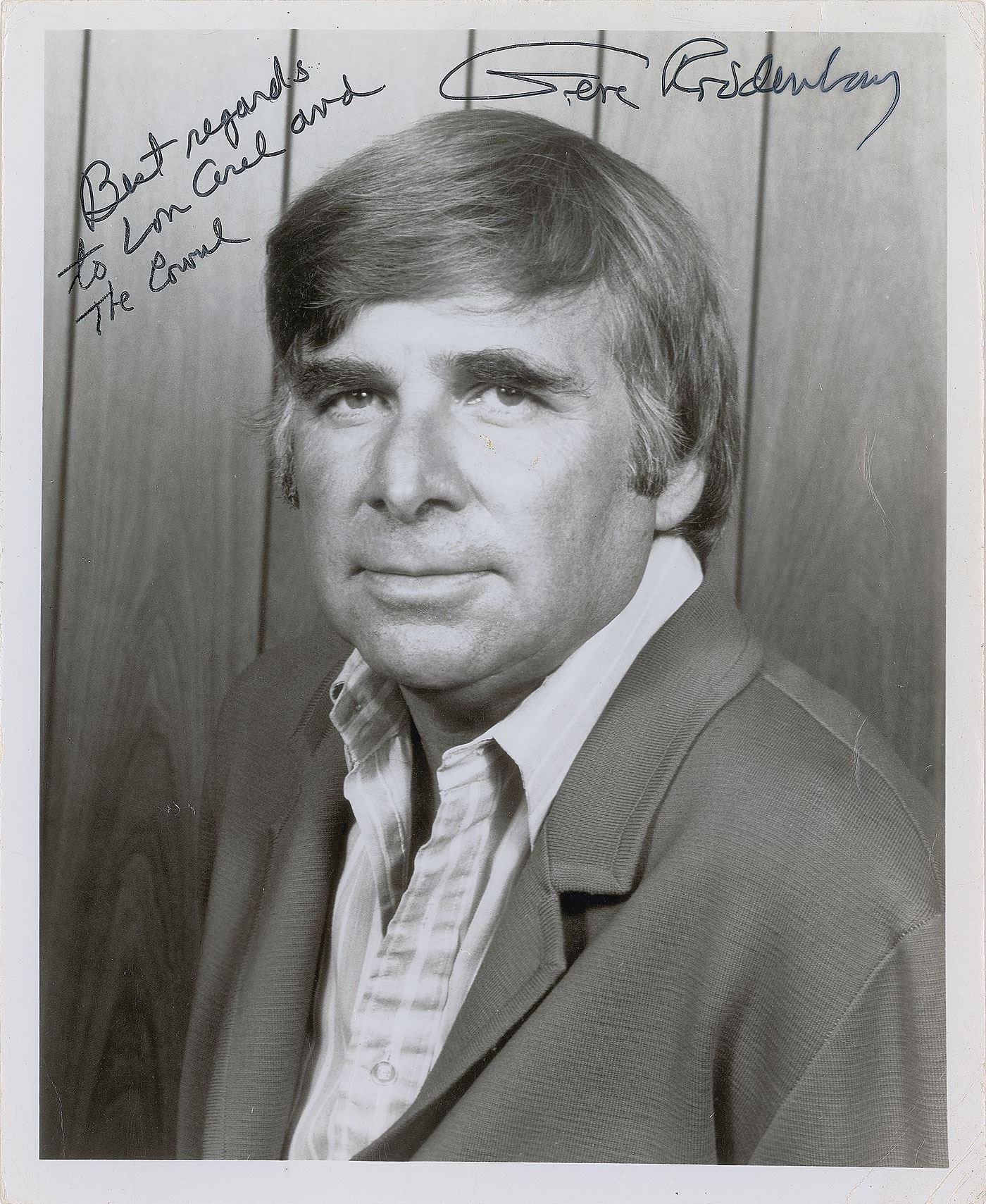 Vintage glossy 8 x 10 photo of the Star Trek creator, signed and inscribed in felt tip, "Best regards to Lon Cerel and The Cowl, Gene Roddenberry.” In very good condition, with moderate overall creasing, including a vertical crease passing through his face. Cerel was a staffer of Providence College's student newspaper, The Cowl.