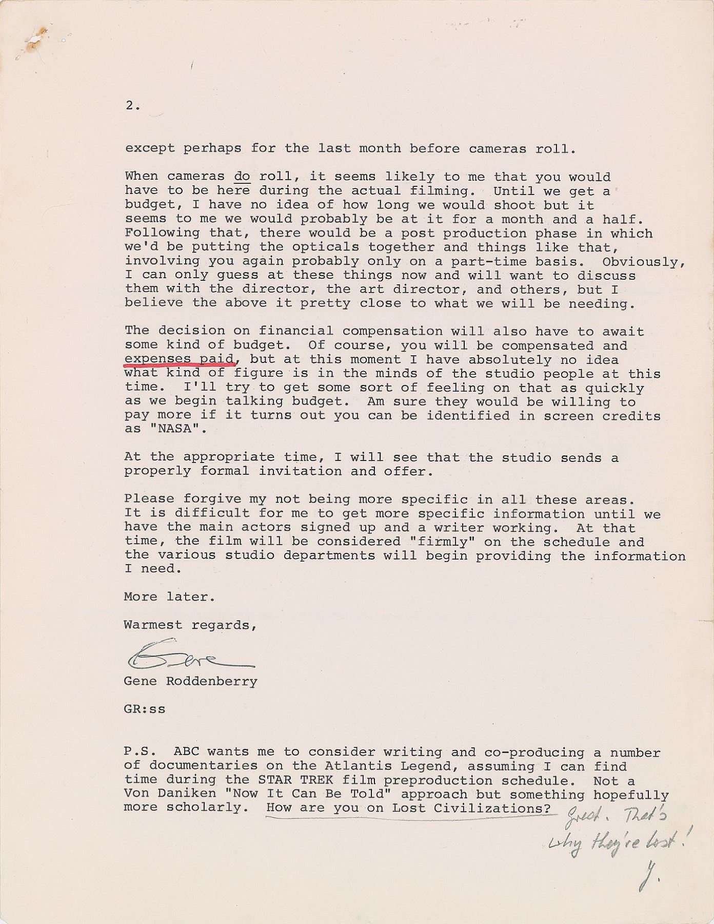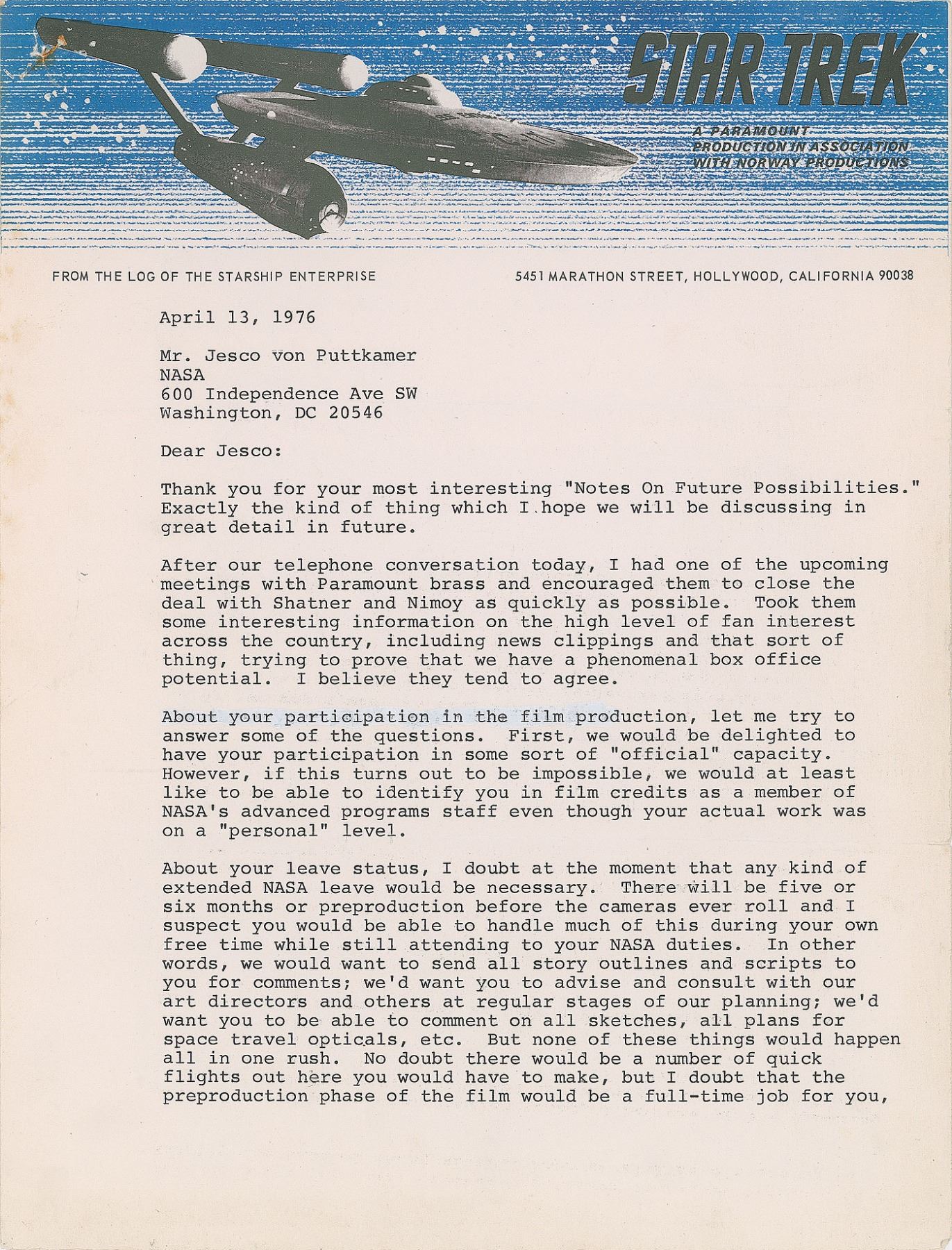 TLS signed “Gene,” two pages, 8.5 x 11, Star Trek letterhead, April 13, 1976. Letter to aerospace engineer and senior NASA manager Jesco von Puttkamer, in part: “After our telephone conversation today, I had one of the upcoming meetings with Paramount brass and encouraged them to close the deal with Shatner and Nimoy as quickly as possible. Took them some interesting information on the high level of fan interest across the country, including news clippings and that sort of thing, trying to prove that we have a phenomenal box office potential. I believe they tend to agree. About your participation in the film production, let me try to answer some of the questions. First, we would be delighted to have your participation in some sort of ‘official’ capacity. However, if this turns out to be impossible, we would at least like to be able to identify you in film credits as a member of NASA’s advanced programs staff even though your actual work was on a ‘personal’ level. About your leave status, I doubt at the very moment that any kids of extended NASA leave would be necessary. There will be five or six months of preproduction before the cameras ever roll and I suspect you would be able to handle much of this during your own free time while still attending your NASA duties. In other words, we want to send all story outlines and scripts to you for comments; we’d want you to advise and consult with our art directors and others at regular stages of our planning; we’d want you to be able to comment on all sketches, all plans for space travel opticals, etc. But none of these things would happen all in one rush. No doubt there would be a number of quick flights out here you would have to make, but I doubt that the preproduction phase of the film would be a full-time job for you, except perhaps for the last month before cameras roll. When cameras do roll, it seems likely to me that you would have to be here during the actual filming. Until we get a budget, I have no idea of how long we would shoot but it seems to me we would probably be at it for a month and a half…The decision on financial compensation will also have to await some kind of budget. Of course, you will be compensated and expenses paid, but at this moment I have absolutely no idea what kind of figure is in the minds of the studio people at this time. I’ll try to get some sort of feeling on that as quickly as we begin talking budget. Am sure they would be willing to pay more if it turns out you can be identified in screen credits as ‘NASA.’” Roddenberry adds a postscript to the conclusion: “ABC wants me to consider writing and co-producing a number of documentaries on the Atlantis Legend, assuming I can find time during the Star Trek film preproduction schedule. Not a Von Daniken ‘Now It Can Be Told’ approach but something hopefully more scholarly. How are you on Lost Civilizations?” Von Puttkamer writes a brief response in pencil, “Great. That’s why they’re lost! J.” In fine condition, with rusty staple holes to the upper left corner. Von Puttkamer worked as technical advisor to Paramount Pictures for the first film based on the hit television series, 1979's Star Trek: The Motion Picture. Among his contributions, Von Puttkamer came up with the hypothetical theory behind the faster-than-light space warp drive, as well as the film's promotional slogan 'The Human Adventure Is Just Beginning.'