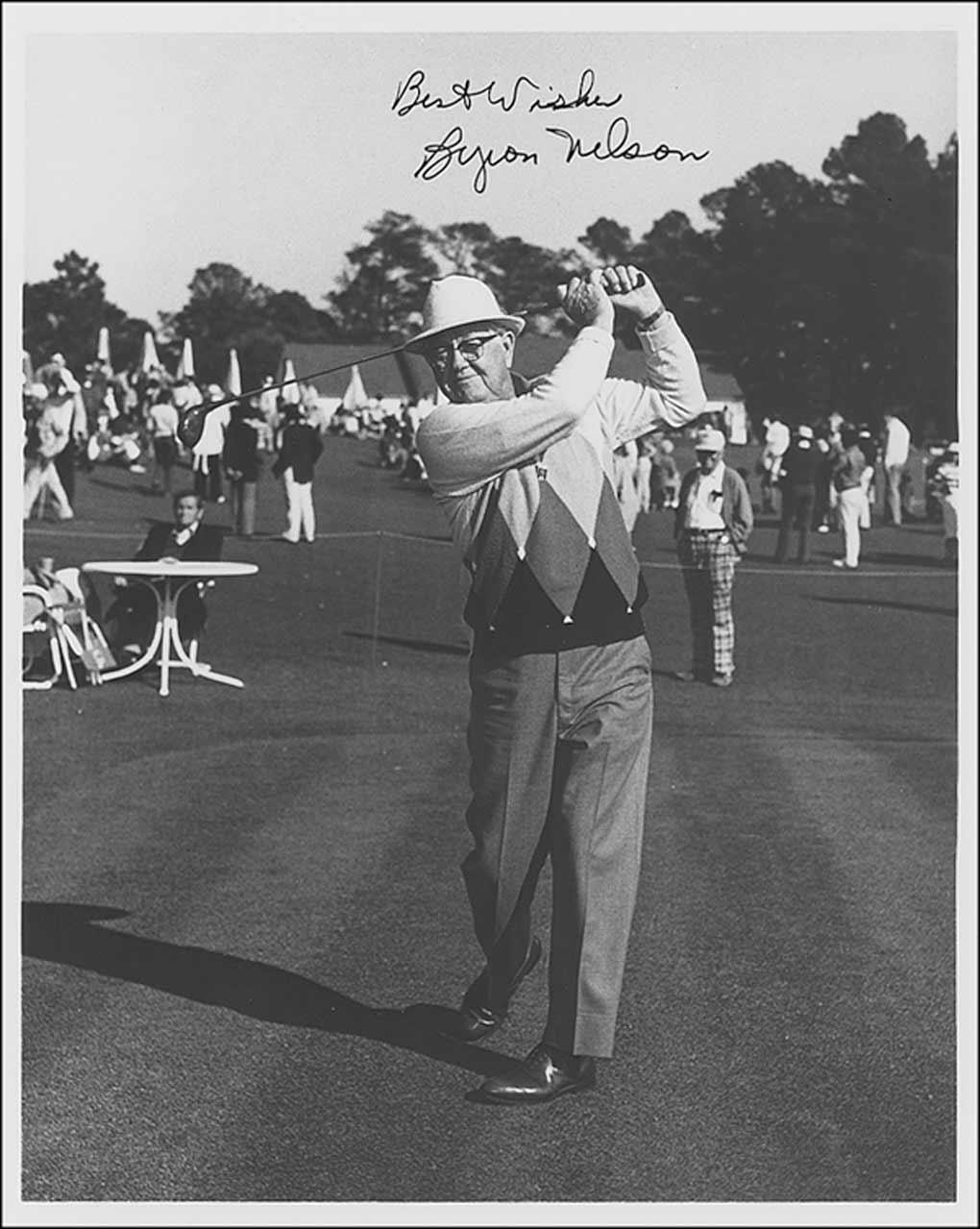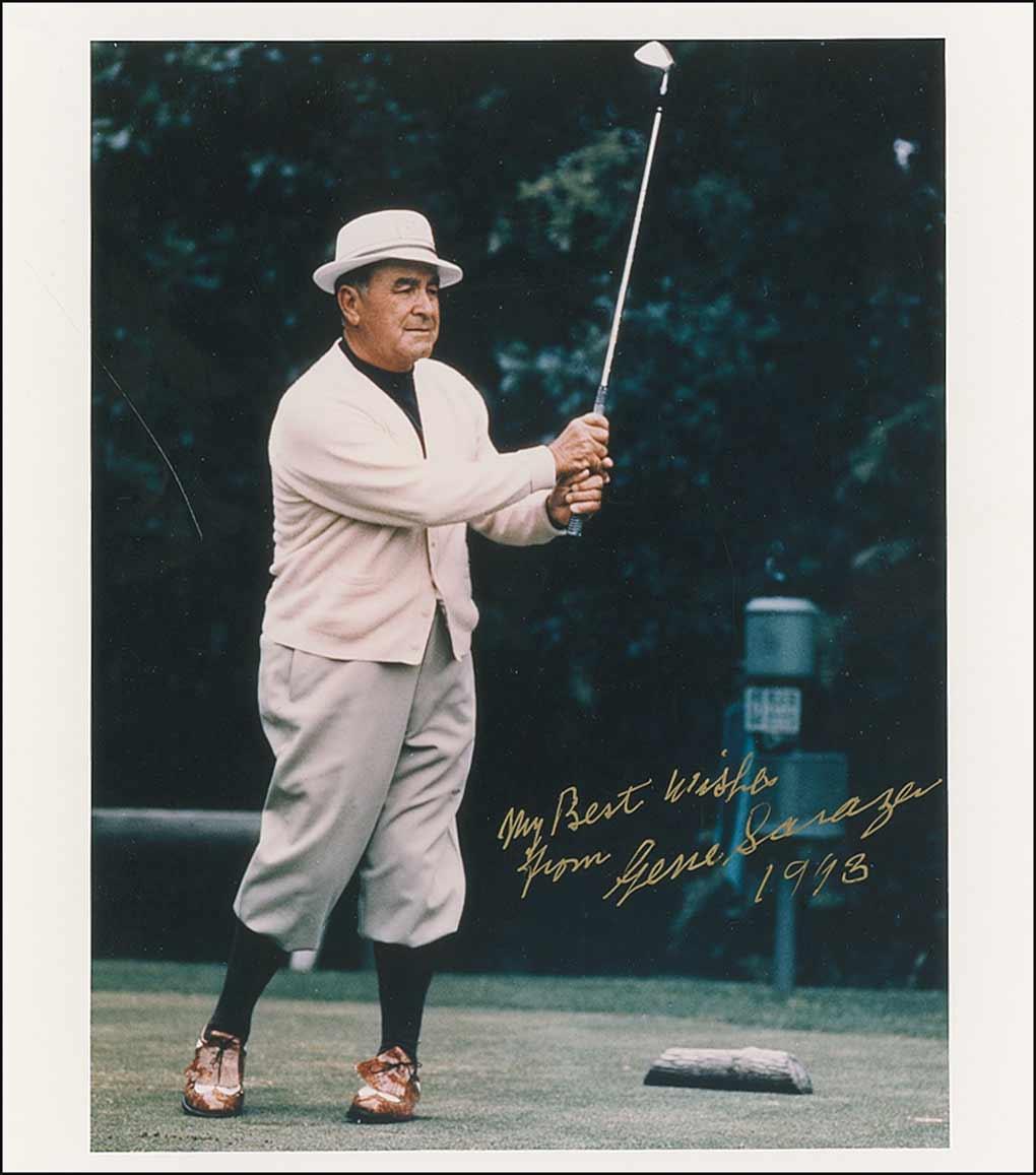 Color satin-finish 8 x 9 photo of Sarazen hitting an iron, signed in gold ink, “My best wishes from Gene Sarazen 1993,”; and a glossy 8 x 10 photo of Nelson teeing off, signed in black felt tip, “Best wishes, Byron Nelson.” In fine condition, with trimmed lower edge to Sarazen’s photo.