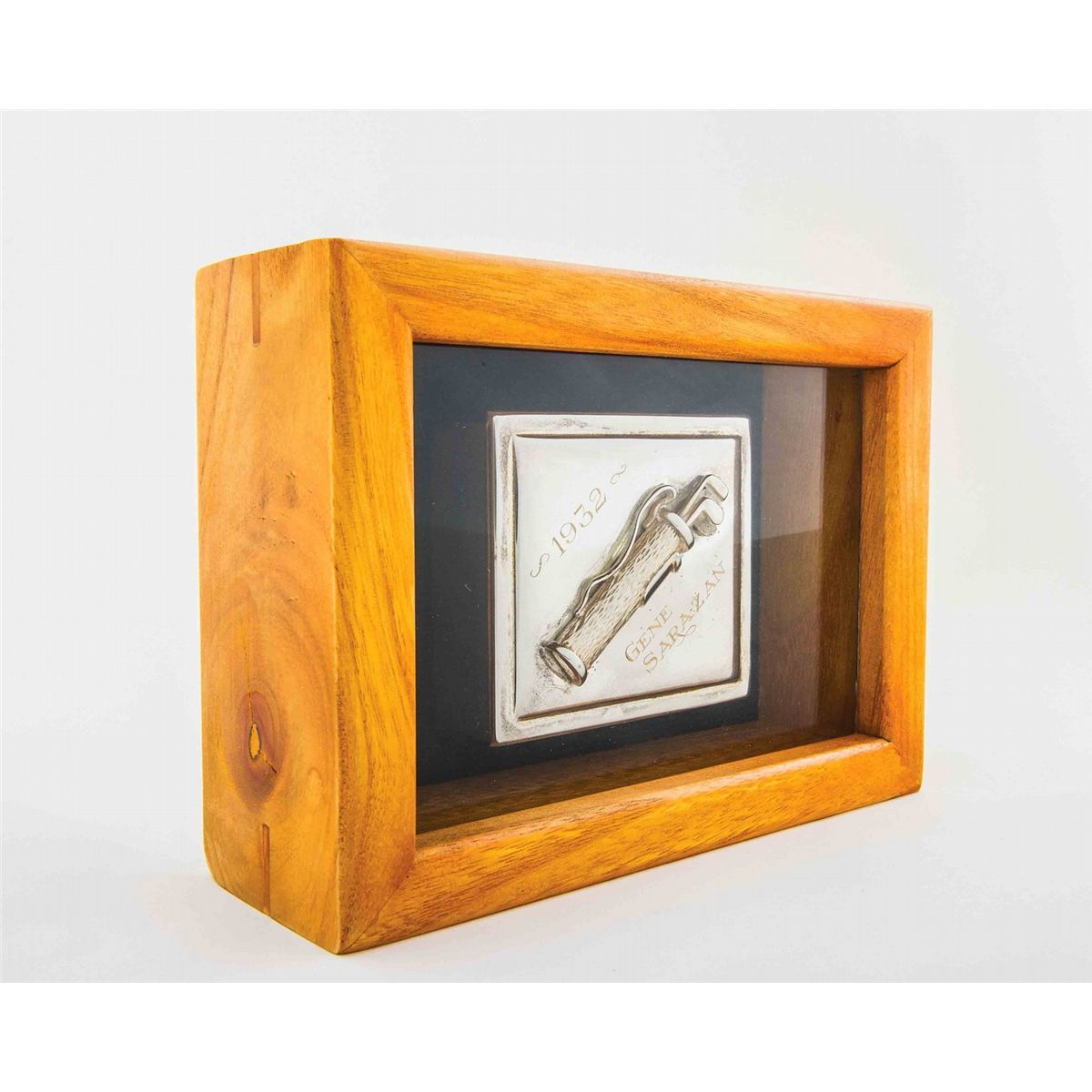Gene Sarazen’s personally-owned hinged silver case, measuring 3.5 x 3 x 1, featuring an impressive raised golf bag full of clubs on the cover, hand-engraved in a lovely artistic script on either side of the bag, “1932” and “Gene Sarazen.” Nicely displayed in a 7.5 x 5.5 x 2.5 shadowbox. In very fine condition. This gorgeous silverbox is particularly noteworthy as the hand-engraved year, “1932,” was one of the greatest of Sarazen’s career—he won both the Open Championship and US Open, and was named Associated Press Male Athlete of the Year. At the Open Championship, he debuted one of modern golf’s premier innovations—the sand wedge.