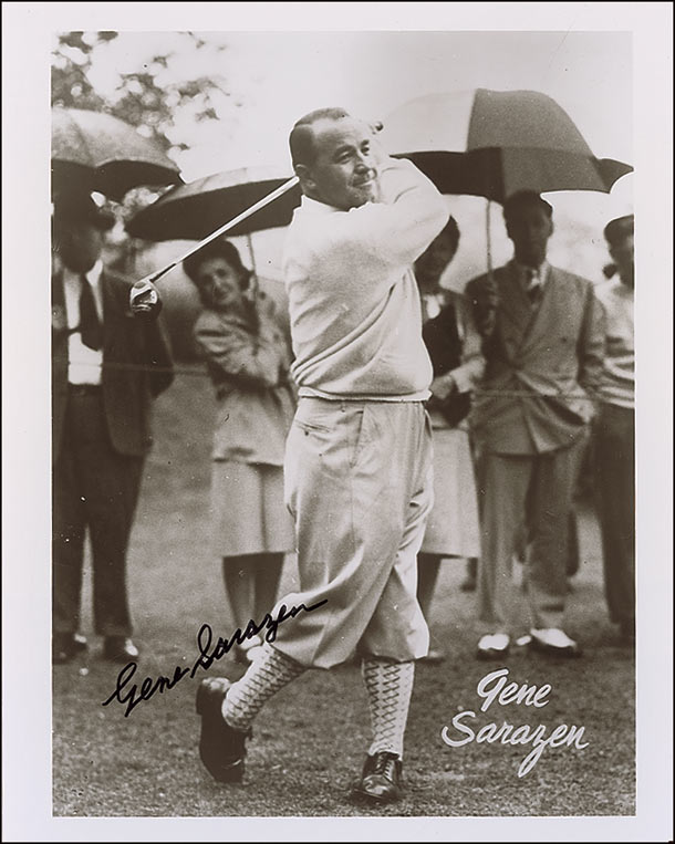 Glossy 8 x 10 photo of Sarazen teeing off in the rain, signed in black felt tip. In very fine condition.